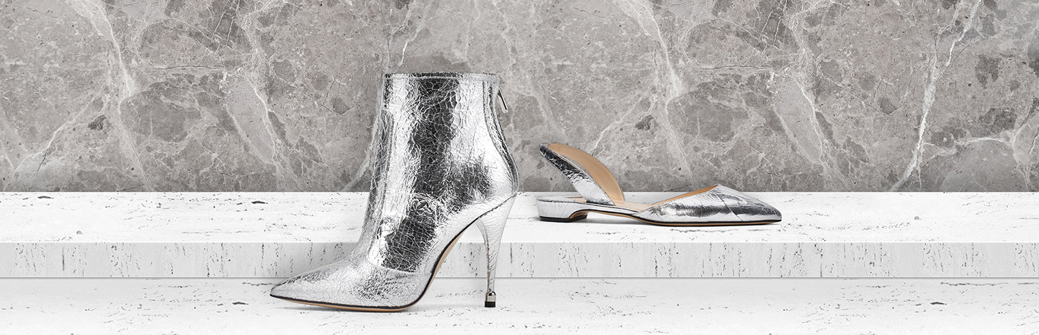 A delicate ankle strap sandal in striking silver metallic nappa & crackle boucle atop a graceful 100mm heel.