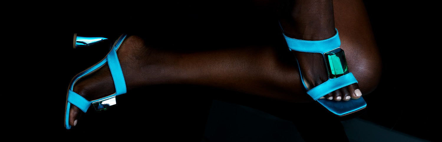 Open toe strappy sandal in blossom patent with a shearling insole, featuring our signtrual 'A' buckles and sculptural stiletto heel hand-encrusted with rhinestones and pearls.