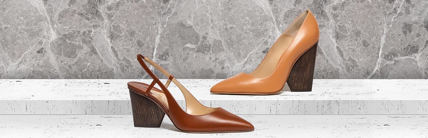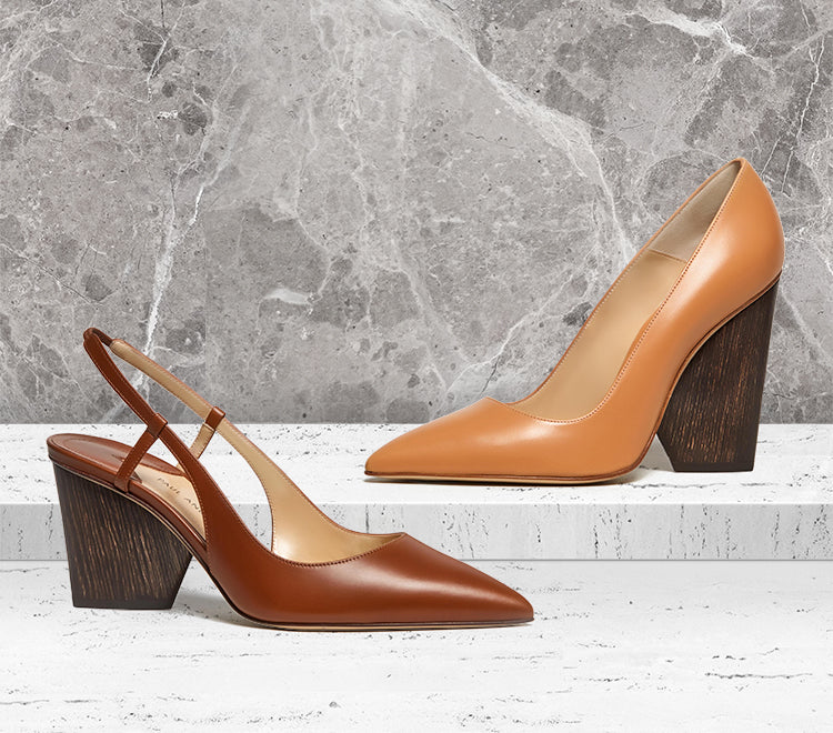 A reinterpreted classic pump in exquisite cuoio cow hide with a 100mm wooden block heel.