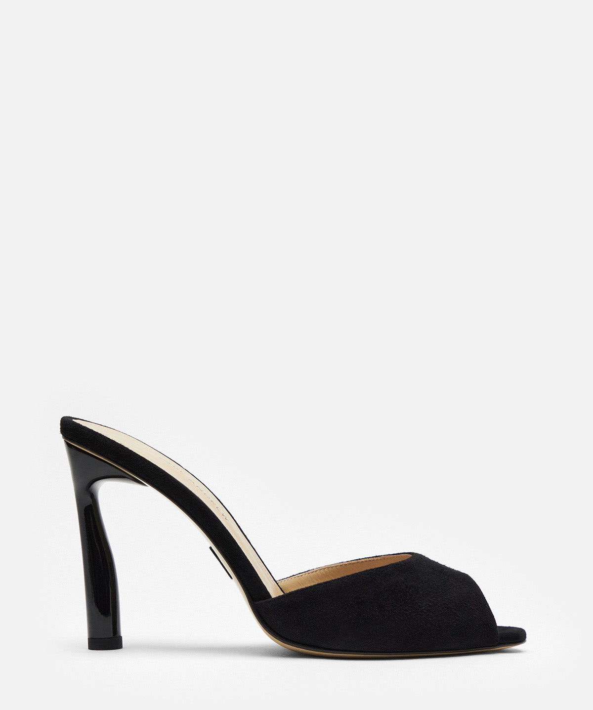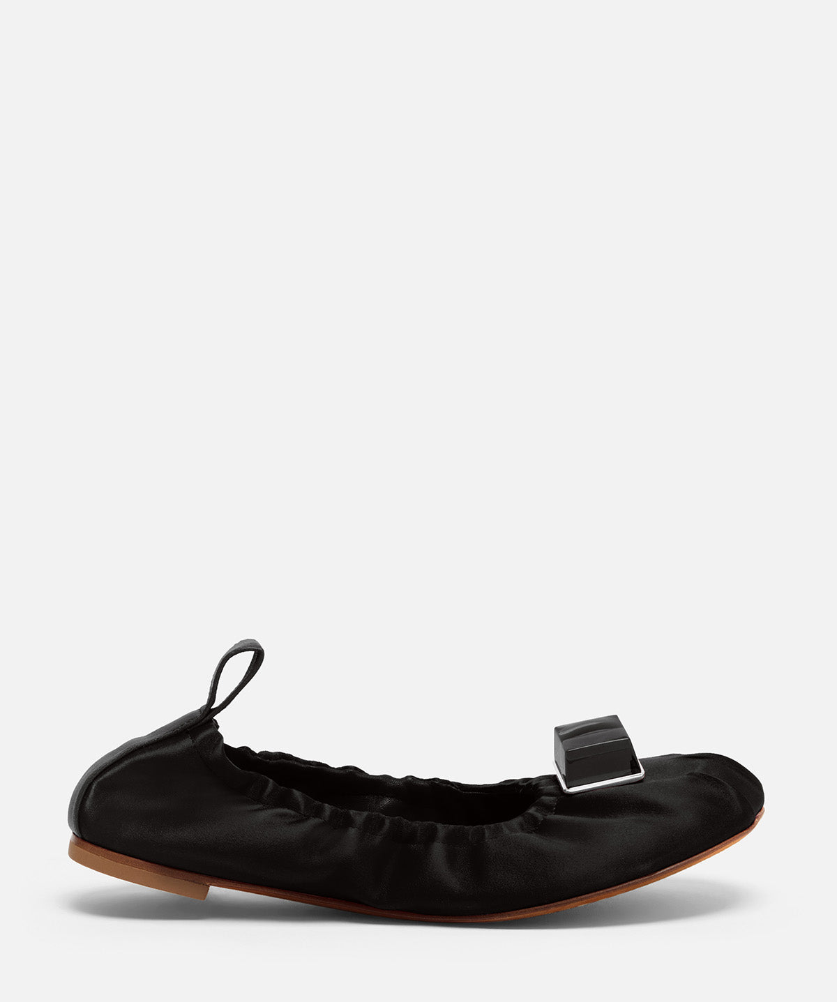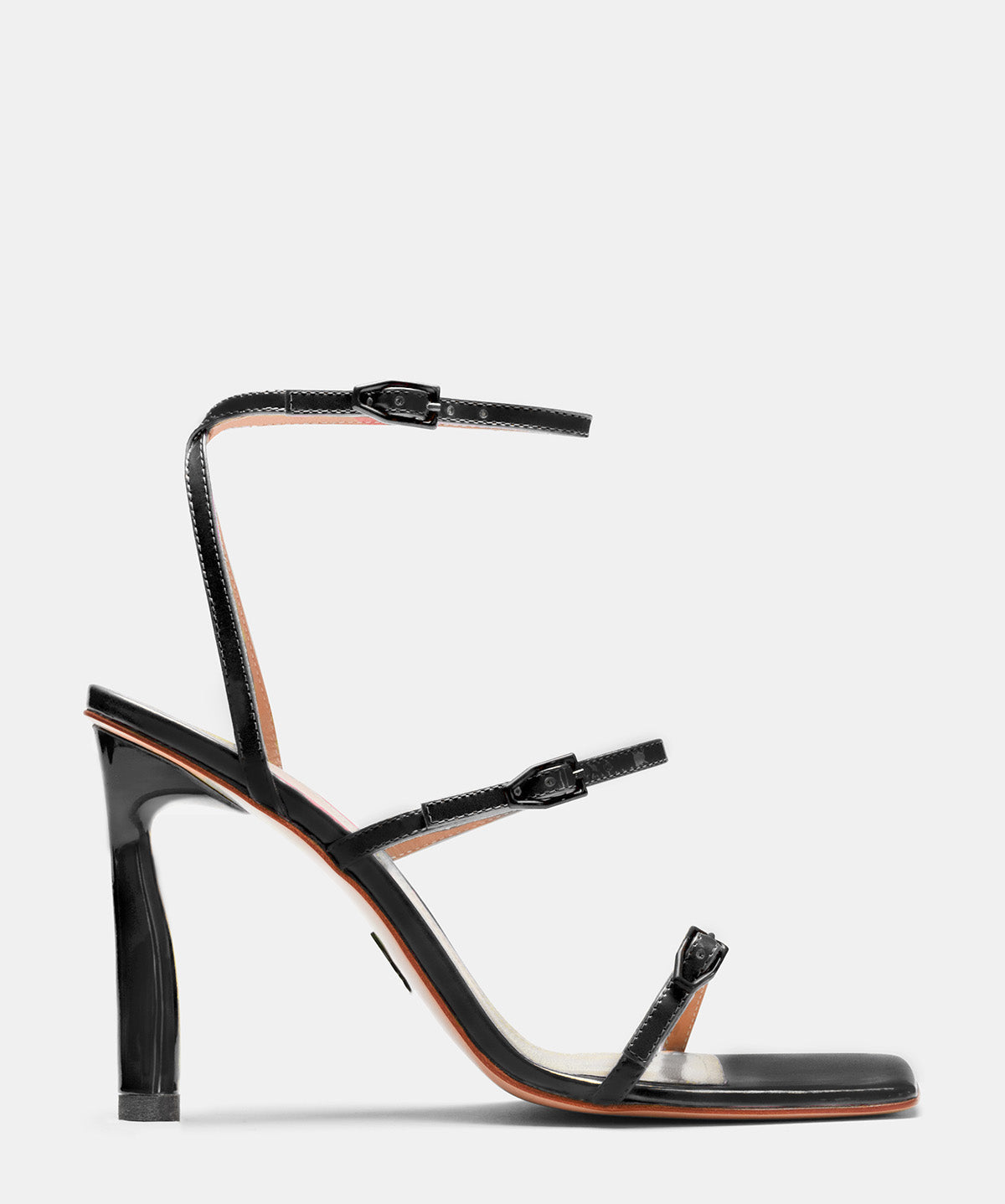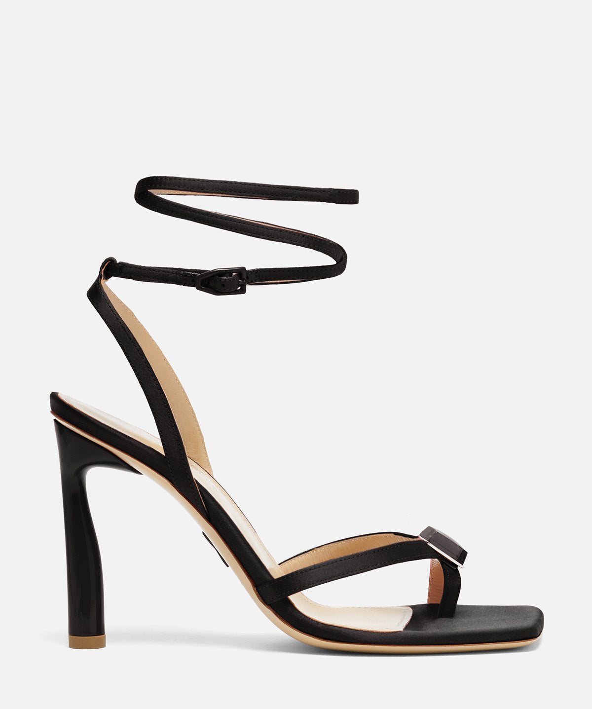TOE-RING ANKLE-WRAP SANDAL IN BLACK SATIN FEATURING A TRANSPARENT PLEXIGLASS ICE-CUBE ACCESSORY AND OUR SIGNTAURE 95mm SCULPTURAL STILETTO HEEL WITH TONAL LACQUER FINISH
