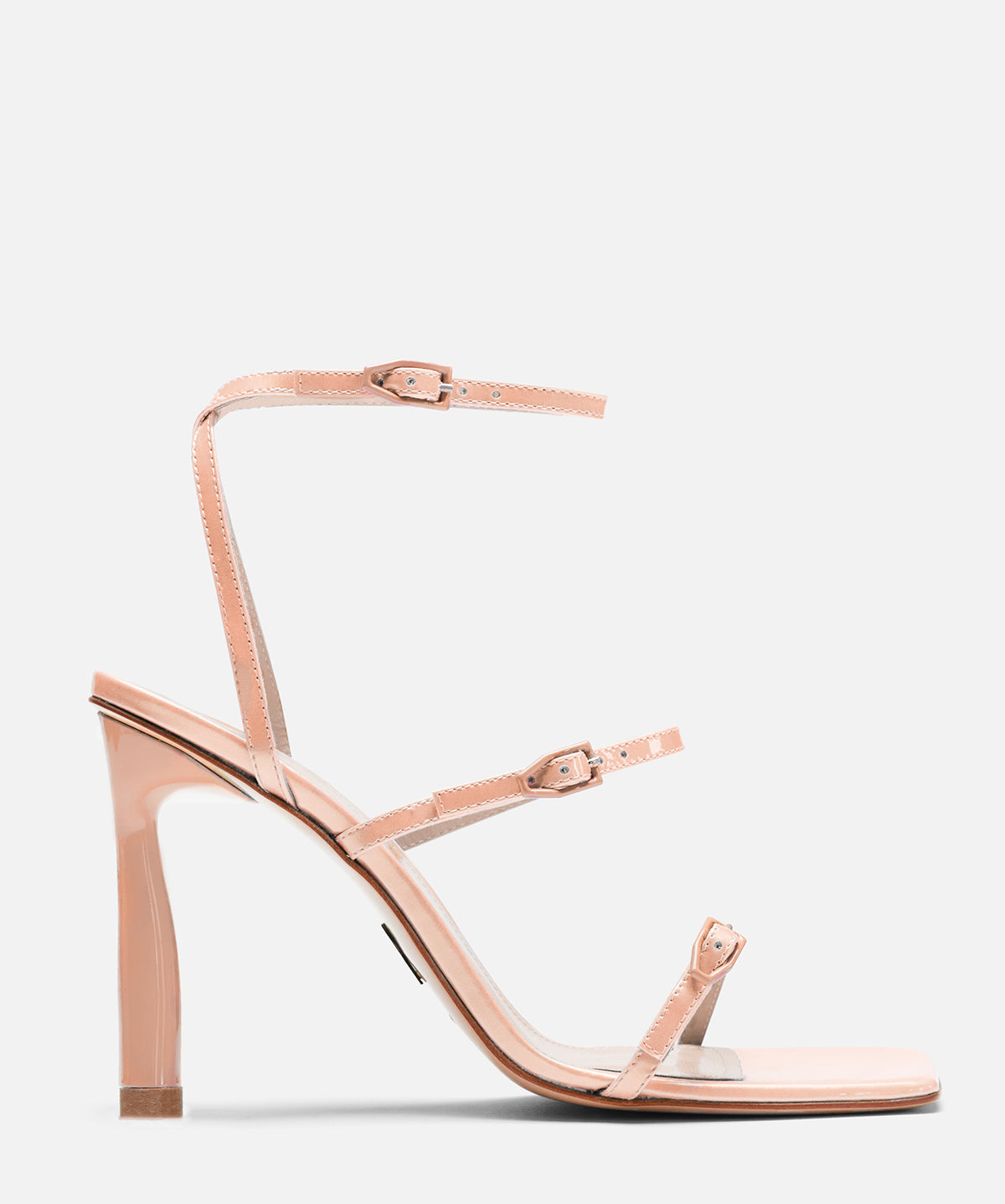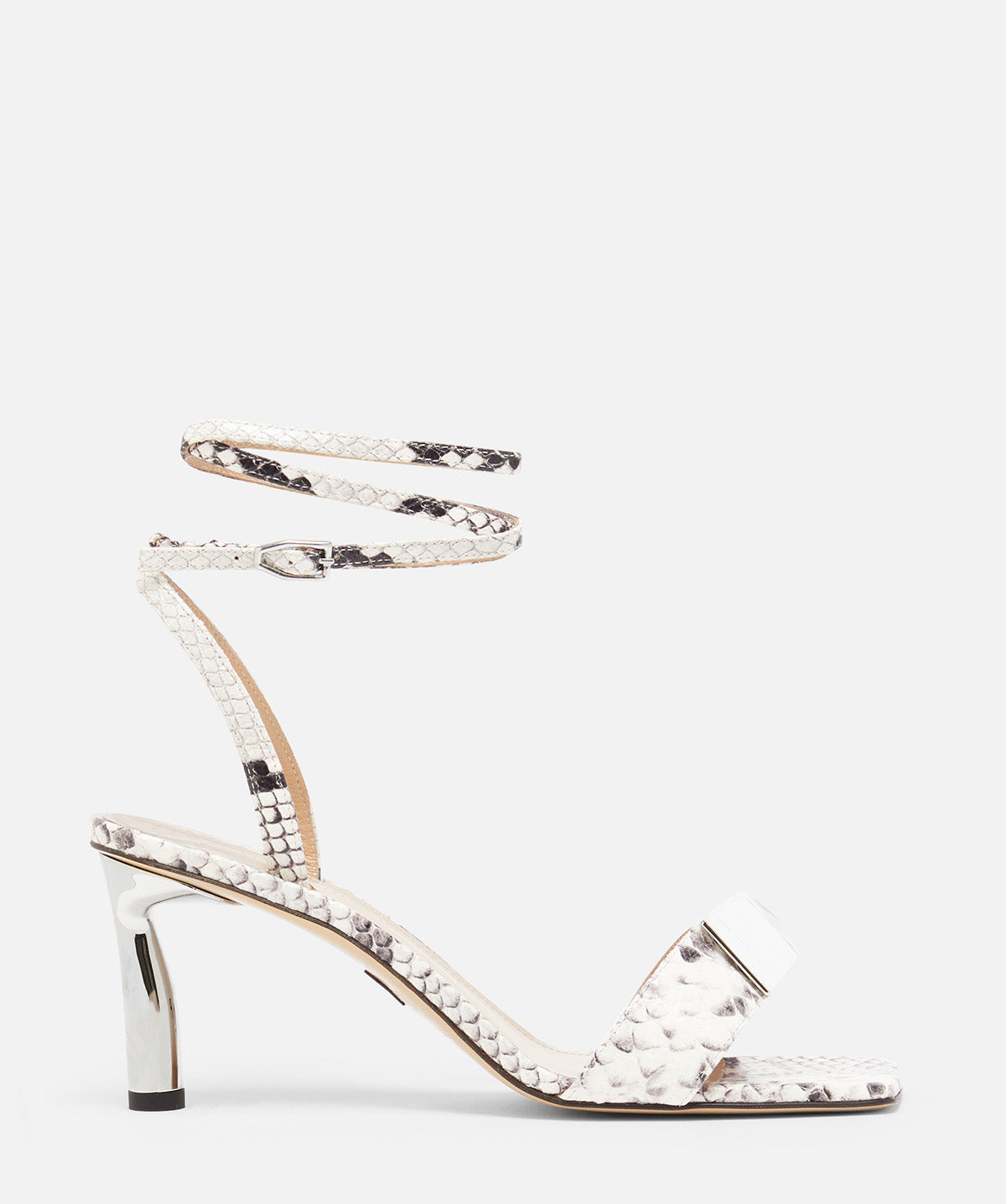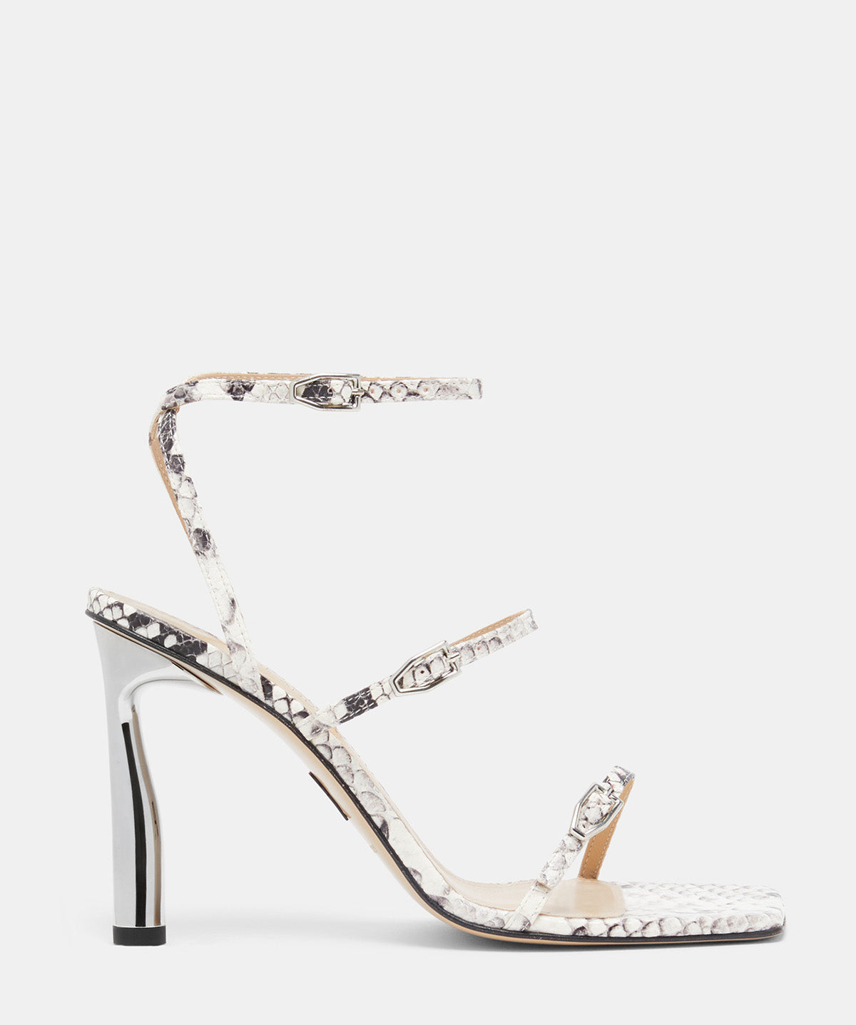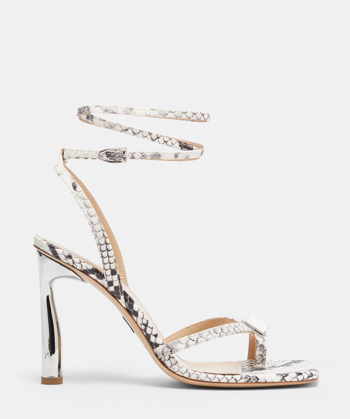 OPEN TOE ANKLE-WRAP SANDAL IN NATURAL SNAKE PRINT CALF FEATURING A TRANSPARENT PLEXIGLASS ICE-CUBE ACCESSORY AND OUR SIGNTAURE 75mm SCULPTURAL STILETTO HEEL WITH GALVANIC CHROME FINISH