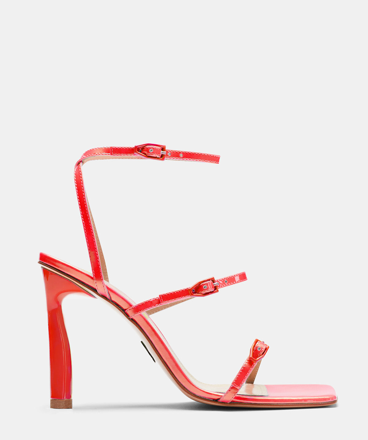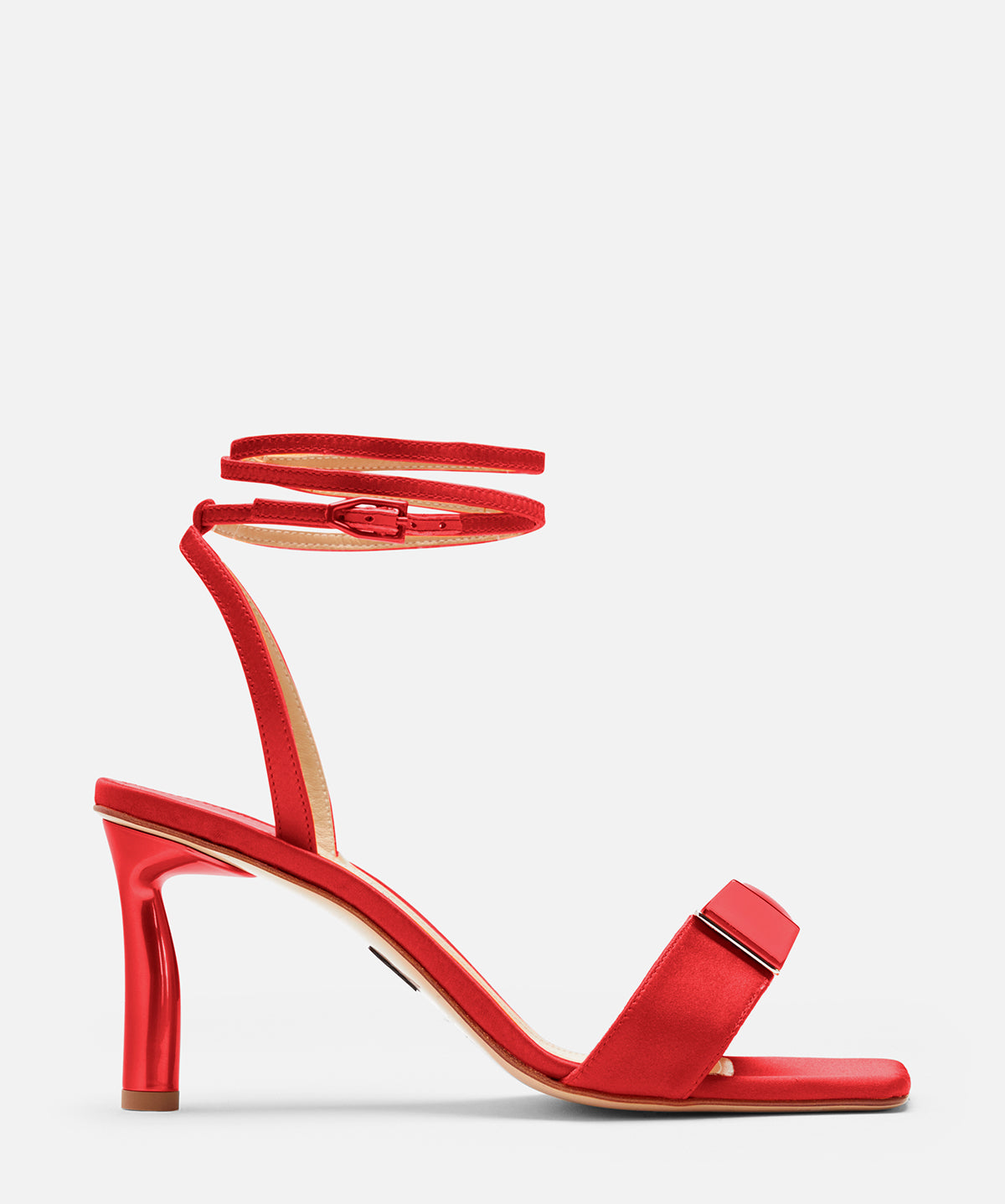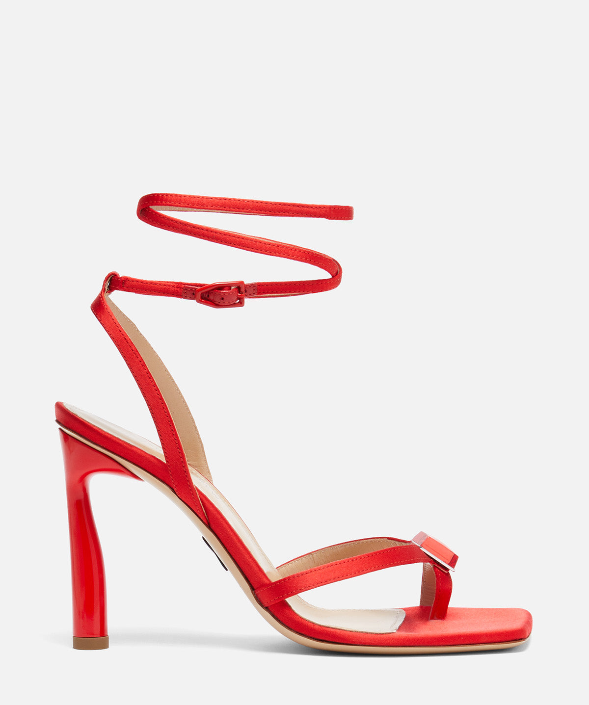 OPEN TOE ANKLE-WRAP SANDAL IN TOMATO SATIN FEATURING A TONAL PLEXIGLASS ICE-CUBE ACCESSORY AND OUR SIGNTAURE 75mm SCULPTURAL STILETTO HEEL WITH TONAL LACQUER FINISH