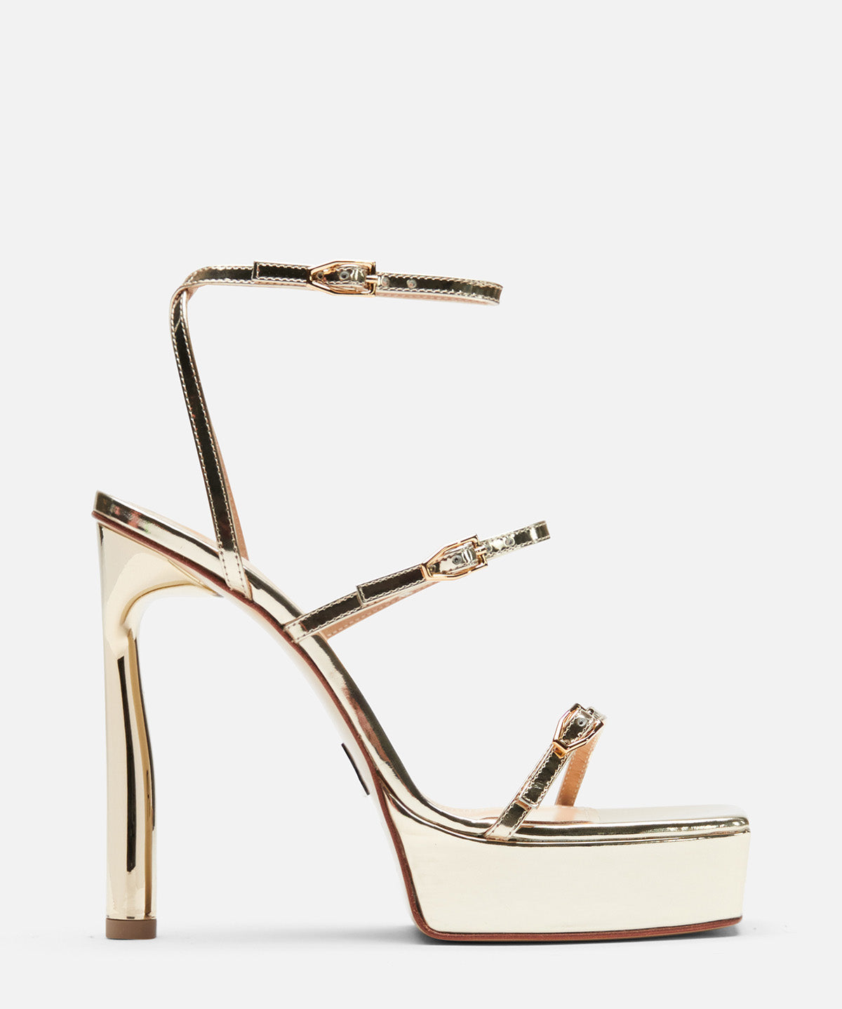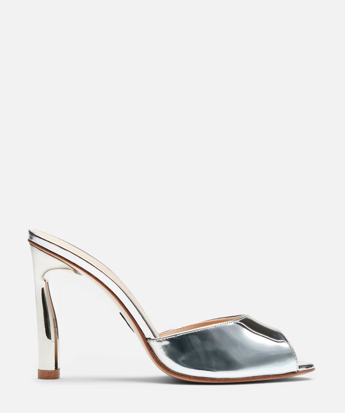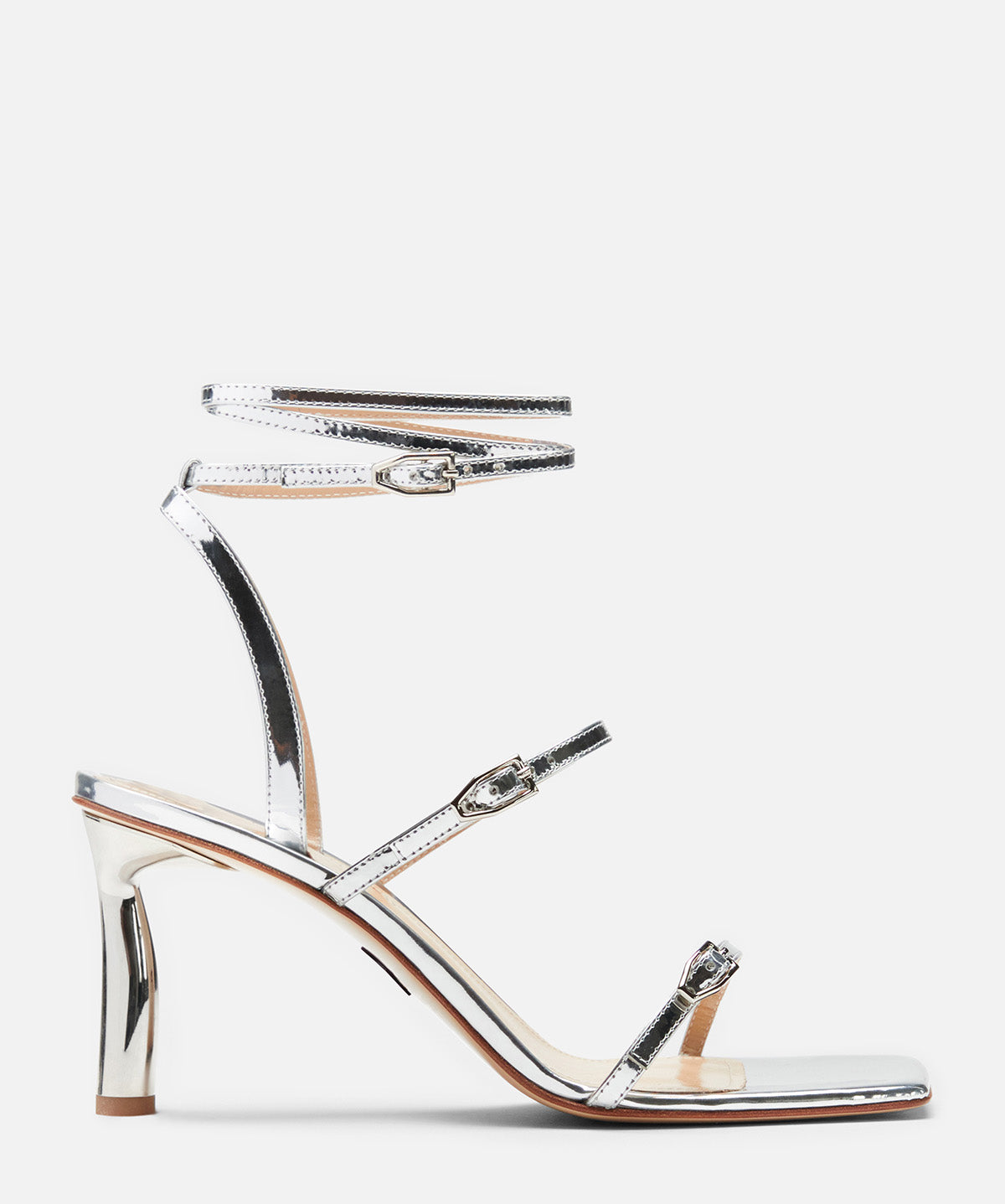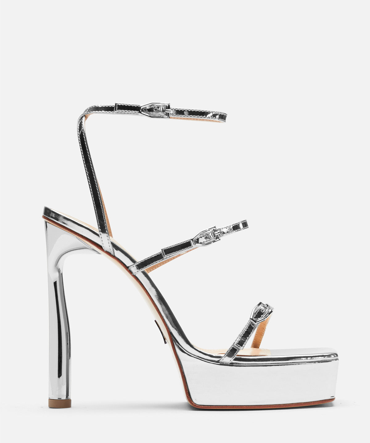 OPEN TOE ANKLE-WRAP SANDAL IN SILVER METALLIC MIRROR FEATURING A TONAL PLEXIGLASS ICE-CUBE ACCESSORY AND OUR SIGNTAURE 120mm SCULPTURAL HEEL WITH A GALVANIC FINISH WITH A 25MM PLATFORM
