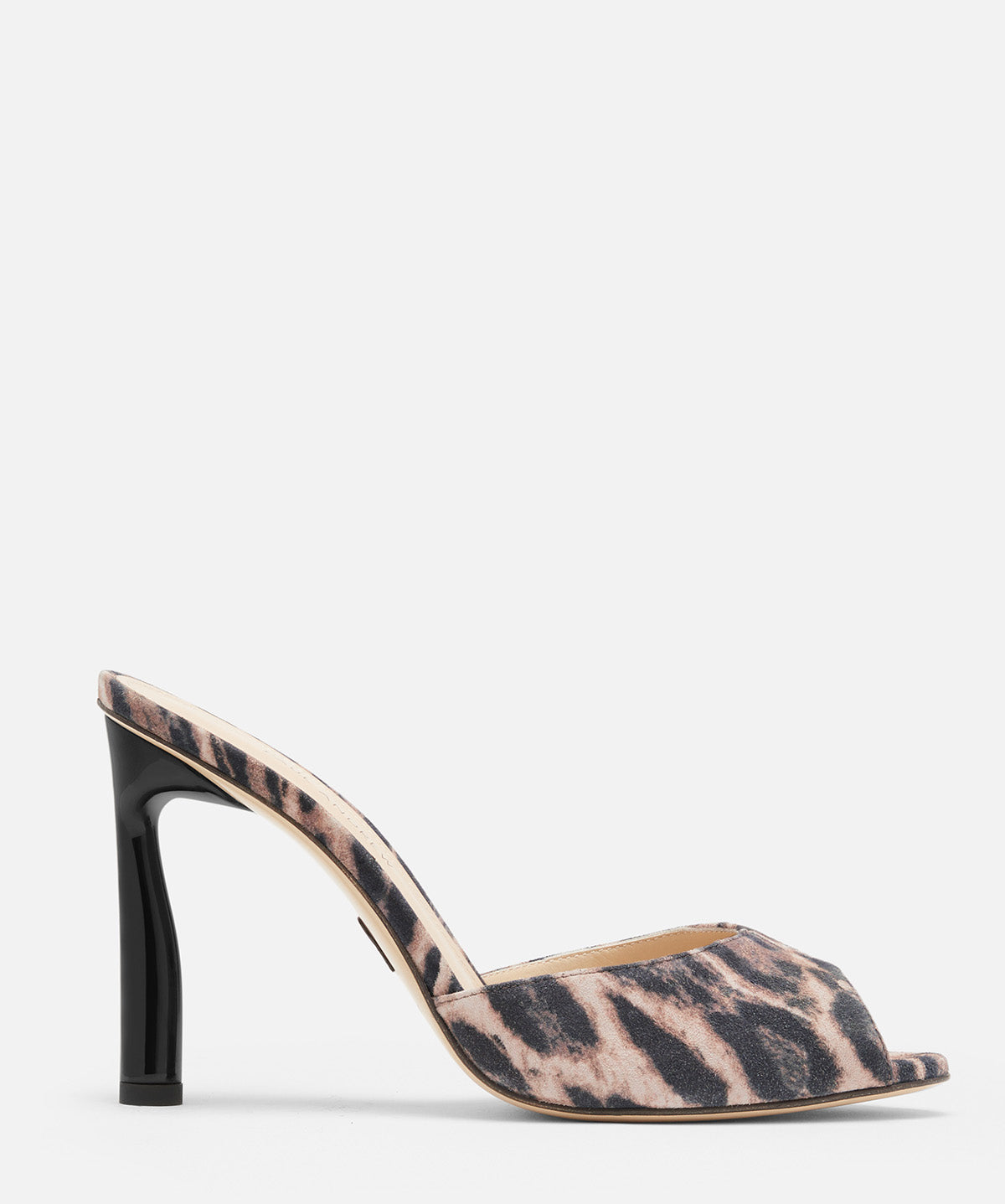 TOE-RING ANKLE-WRAP SANDAL IN LEOPARD ANIMAL PRINT SUEDE FEATURING A FUMÉ PLEXIGLASS ICE-CUBE ACCESSORY AND OUR SIGNTAURE 95mm SCULPTURAL STILETTO HEEL WITH BLACK LACQUER FINISH