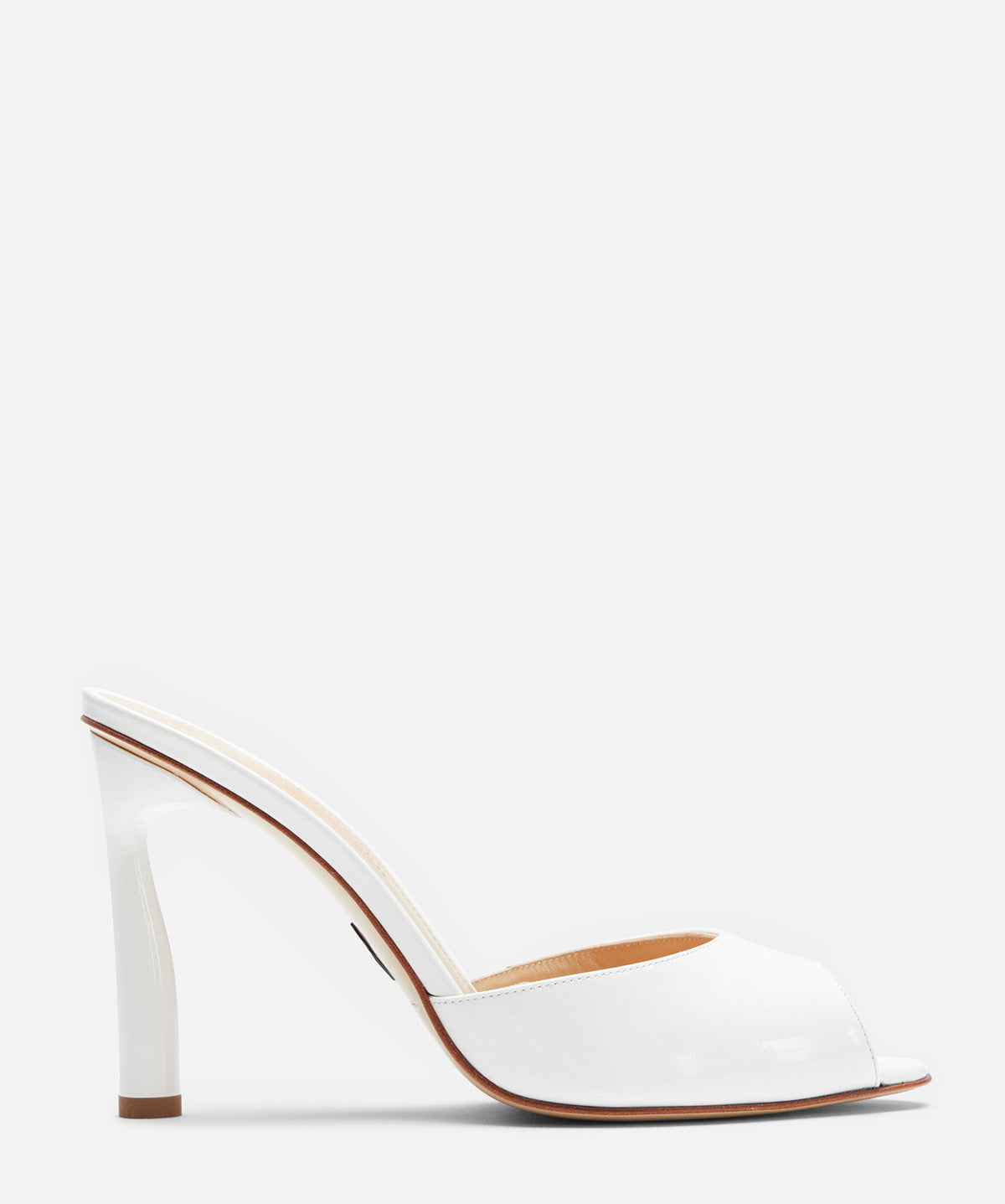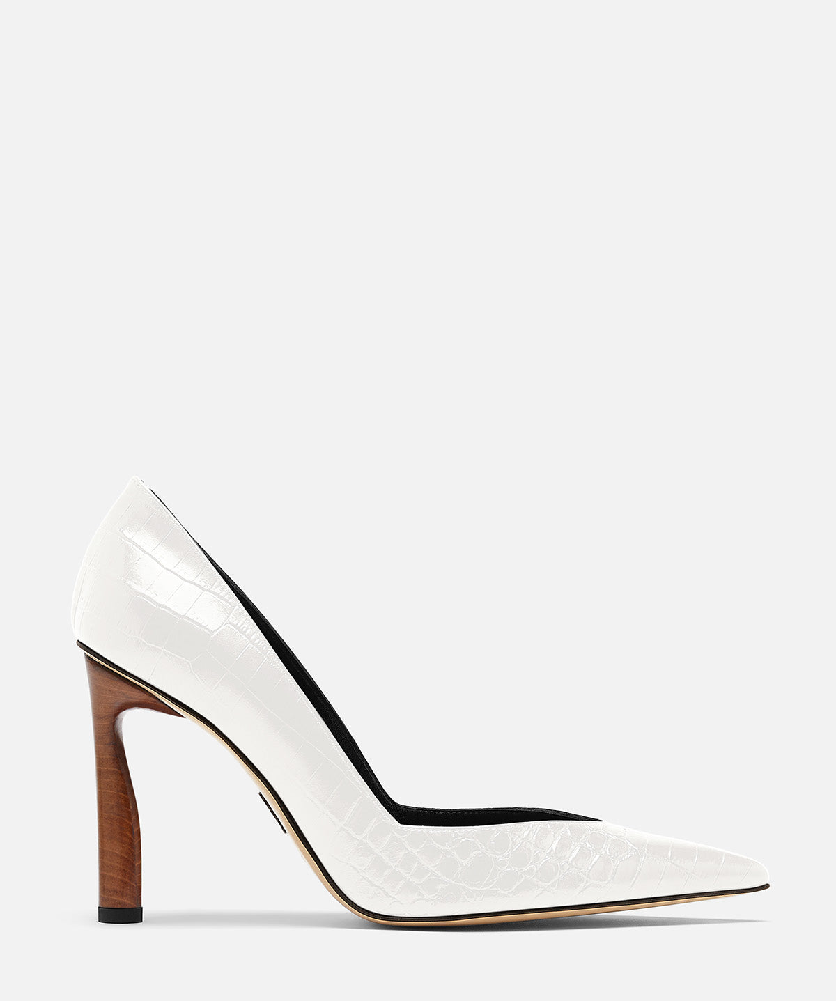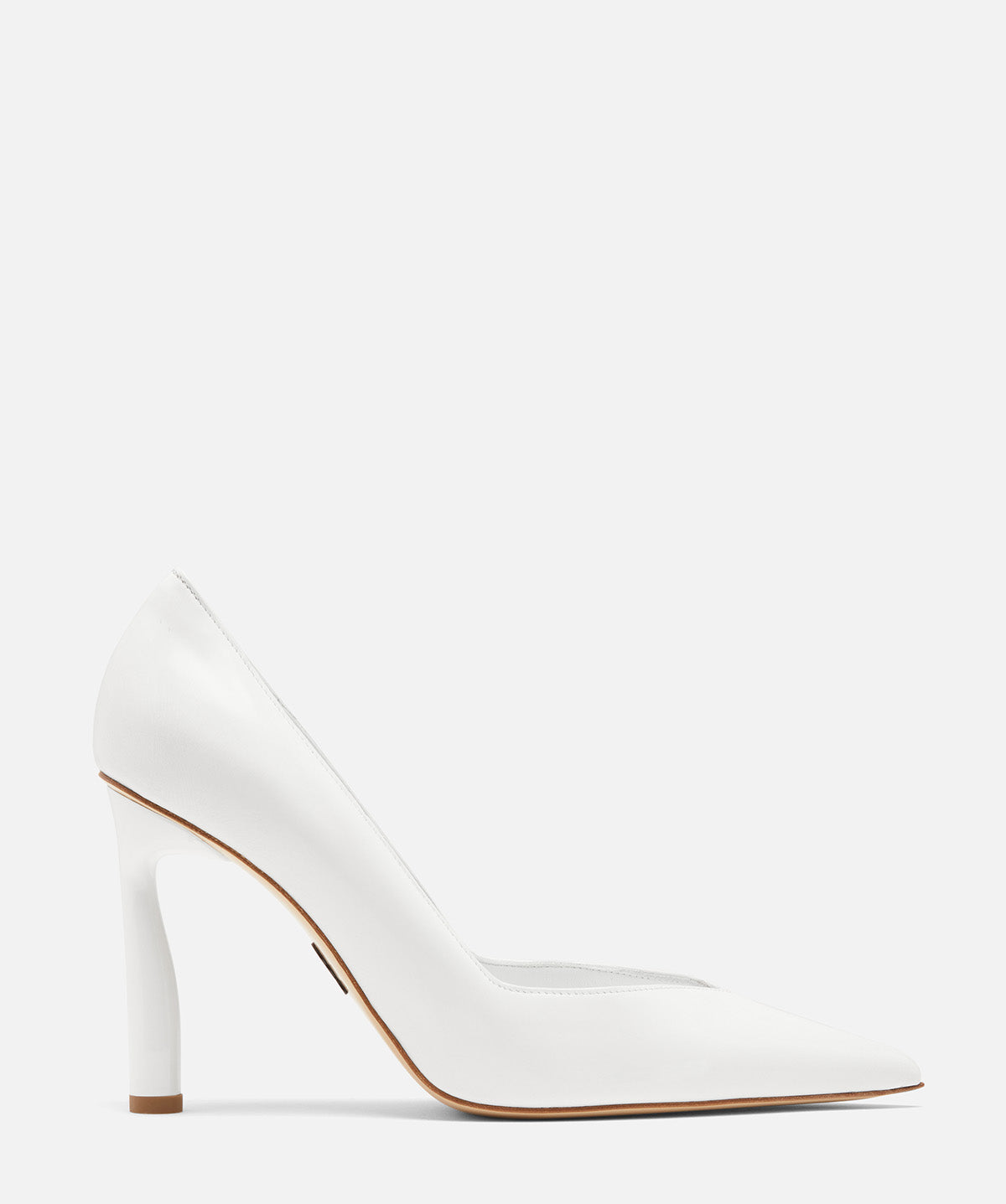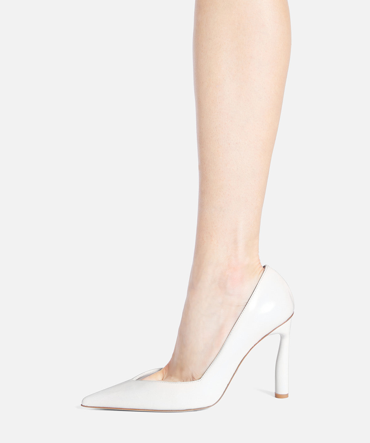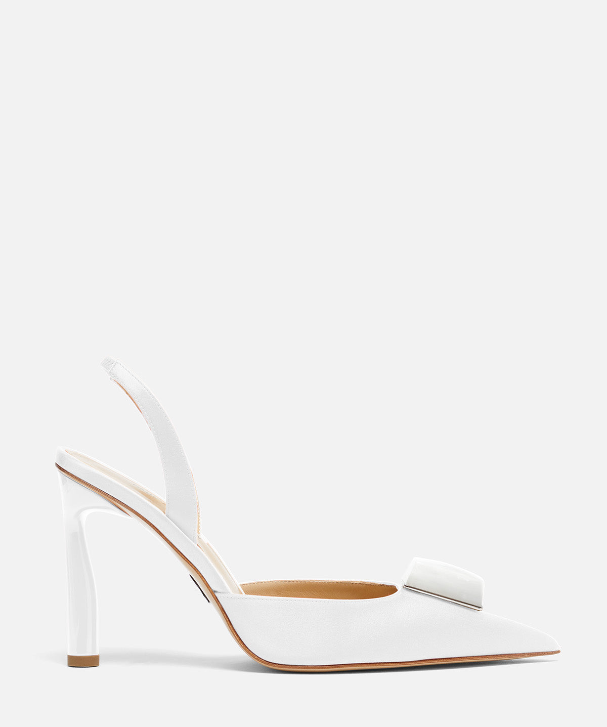 POINTED TOE HALTER-BACK PUMP IN WHITE SATIN, FEATURING A TONAL PLEXIGLASS ICE-CUBE ACCESSORY AND OUR SIGNATURE SCULPTURAL STILETTO HEEL WITH A TONAL LACQUER FINISH