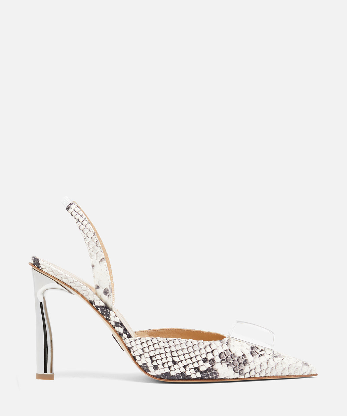 POINTED TOE HALTER-BACK PUMP IN NATURAL SNAKE PRINT CALF, FEATURING A TRANSPARENT PLEXIGLASS ICE-CUBE ACCESSORY AND OUR SIGNATURE SCULPTURAL STILETTO HEEL WITH A GALVANIC CHROME FINISH