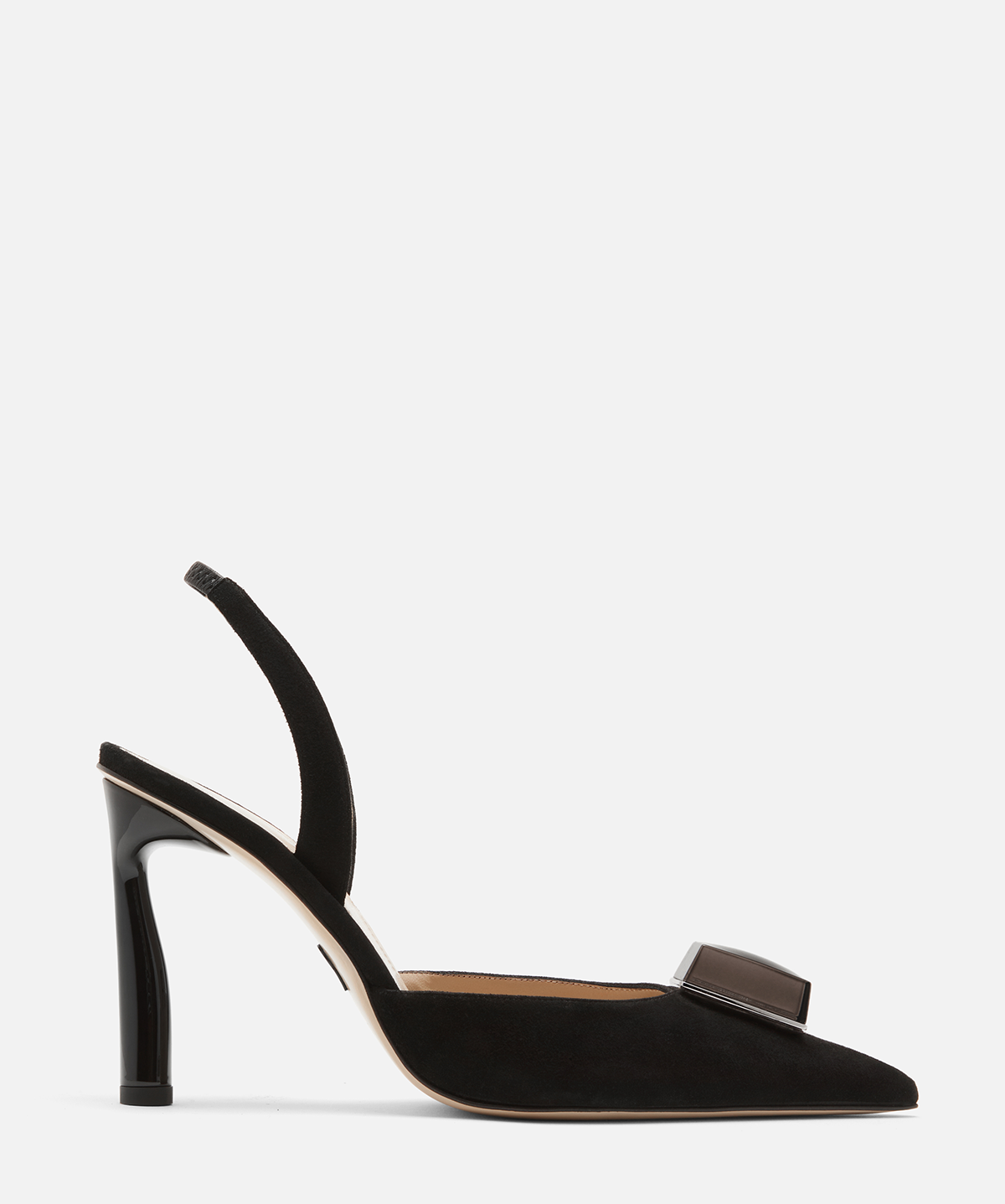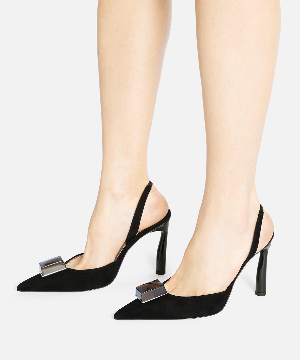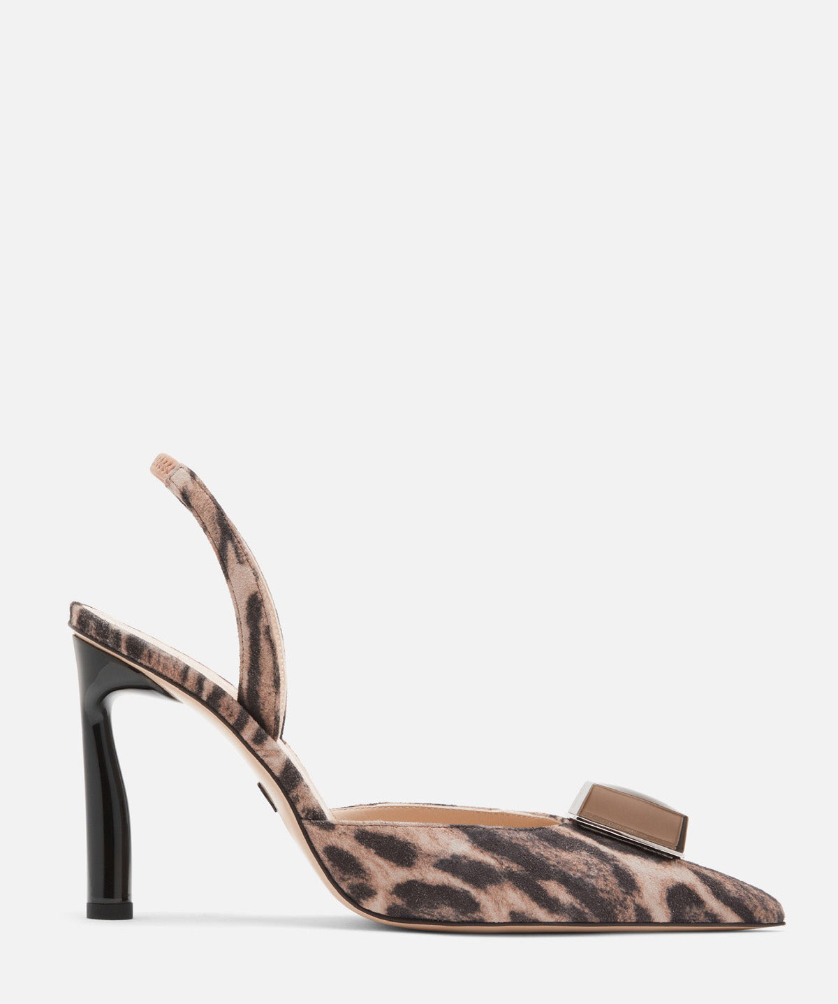 POINTED TOE HALTER-BACK PUMP IN LEOPARD ANIMLA PRINT SUEDE, FEATURING A FUMÉ PLEXIGLASS ICE-CUBE ACCESSORY AND OUR SIGNATURE SCULPTURAL STILETTO HEEL WITH A BLACK LACQUER FINISH