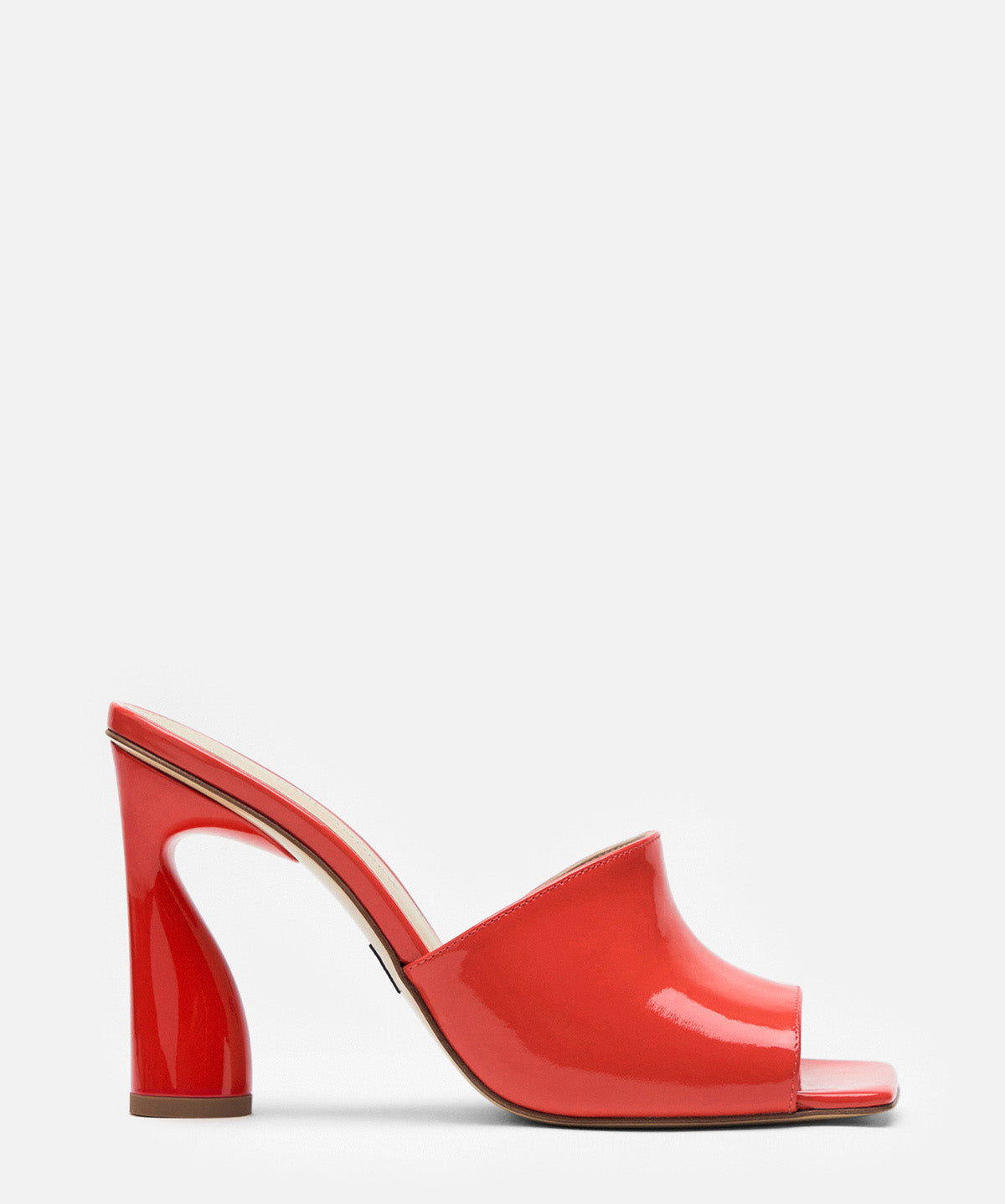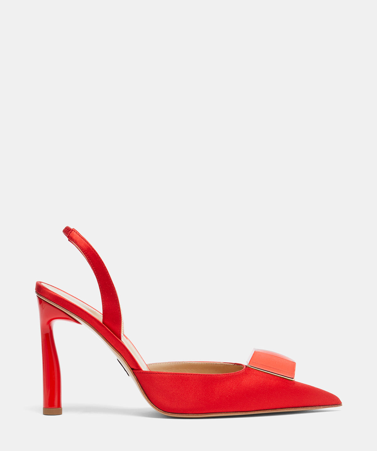 POINTED TOE HALTER-BACK PUMP IN TOMATO SATIN, FEATURING A TONAL PLEXIGLASS ICE-CUBE ACCESSORY AND OUR SIGNATURE SCULPTURAL STILETTO HEEL WITH A TONAL LACQUER FINISH
