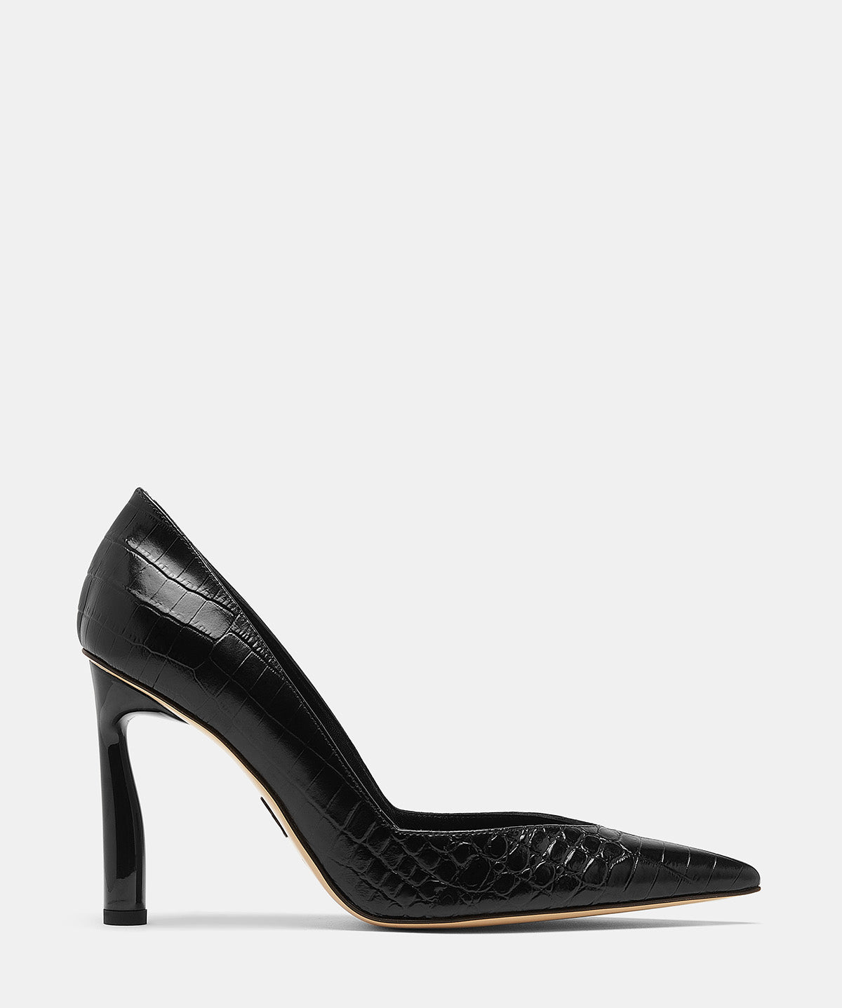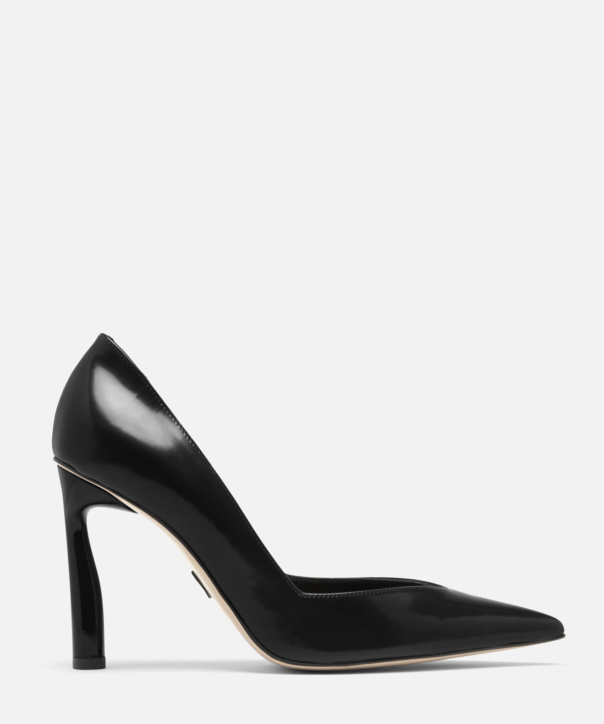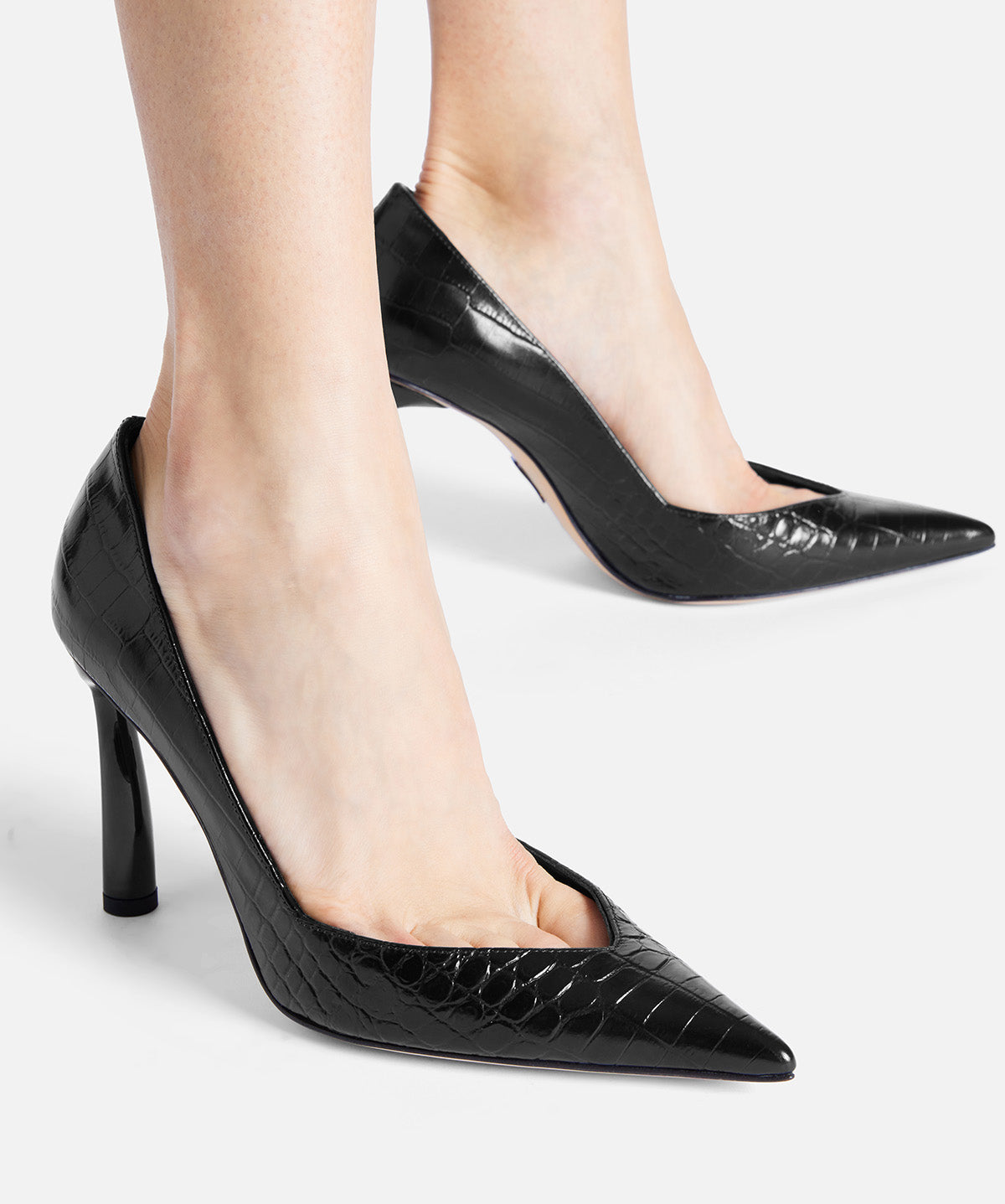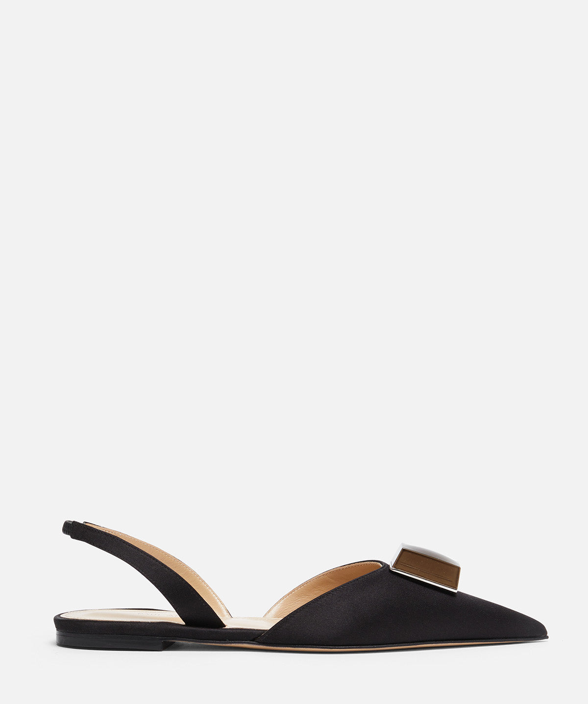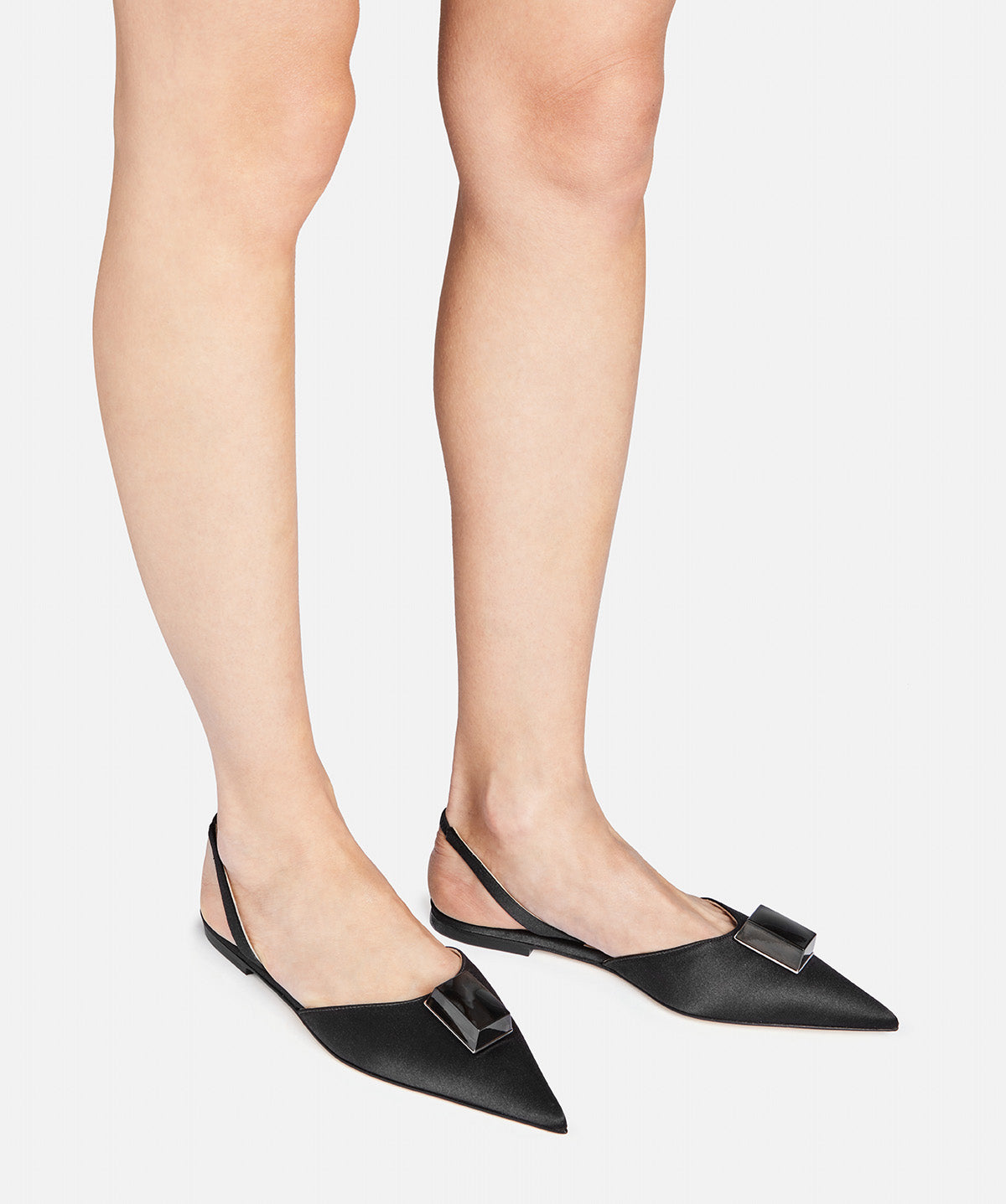 POINTED TOE HALTER-BACK PUMP IN BLACK SATIN, FEATURING A FUMÉ PLEXIGLASS ICE-CUBE ACCESSORY AND OUR SIGNATURE SCULPTURAL STILETTO HEEL WITH A TONAL LACQUER FINISH