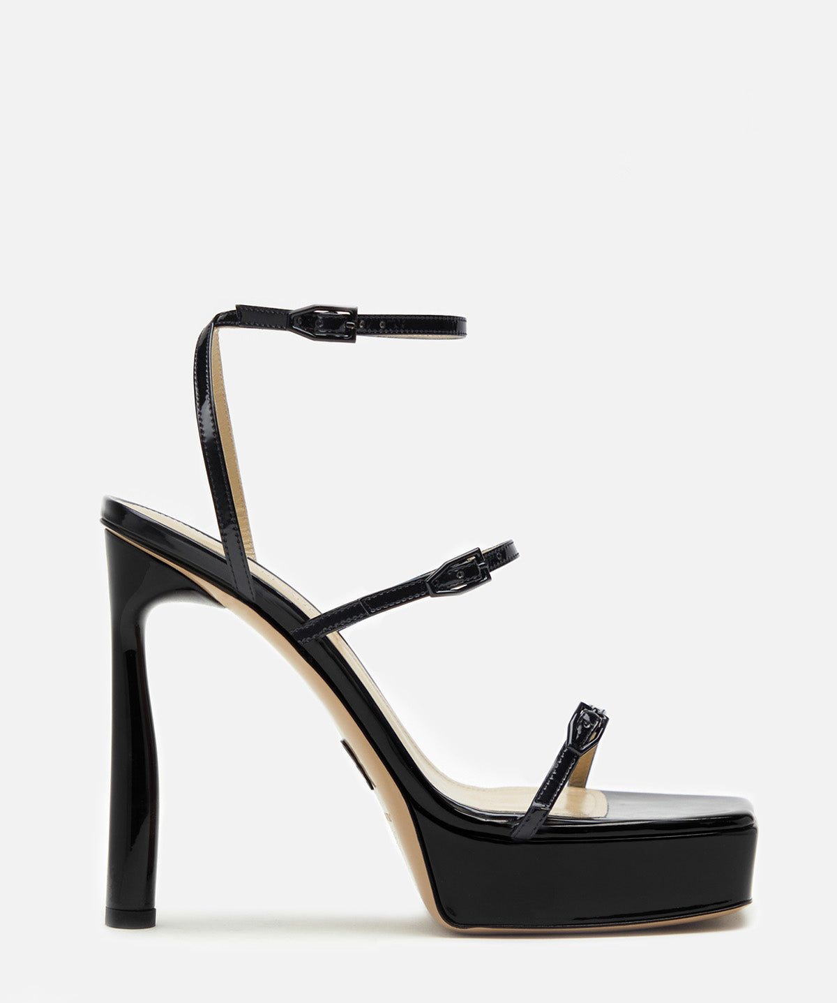 OPEN TOE ANKLE-WRAP SANDAL IN BLACK SATIN FEATURING A TONAL PLEXIGLASS ICE-CUBE ACCESSORY AND OUR SIGNTAURE 120mm SCULPTURAL HEEL WITH A GALVANIC FINISH WITH A 25MM PLATFORM