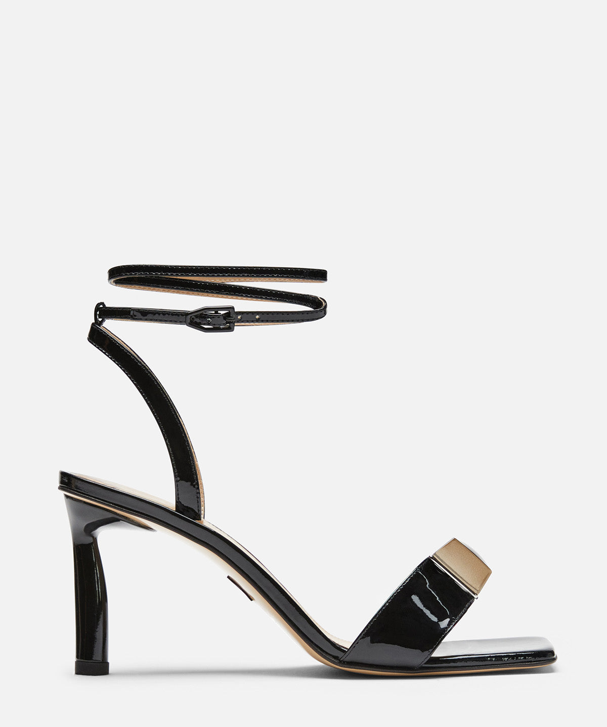 OPEN TOE ANKLE-WRAP SANDAL IN BLACK SATIN FEATURING A TONAL PLEXIGLASS ICE-CUBE ACCESSORY AND OUR SIGNTAURE 75mm SCULPTURAL STILETTO HEEL WITH TONAL LACQUER FINISH