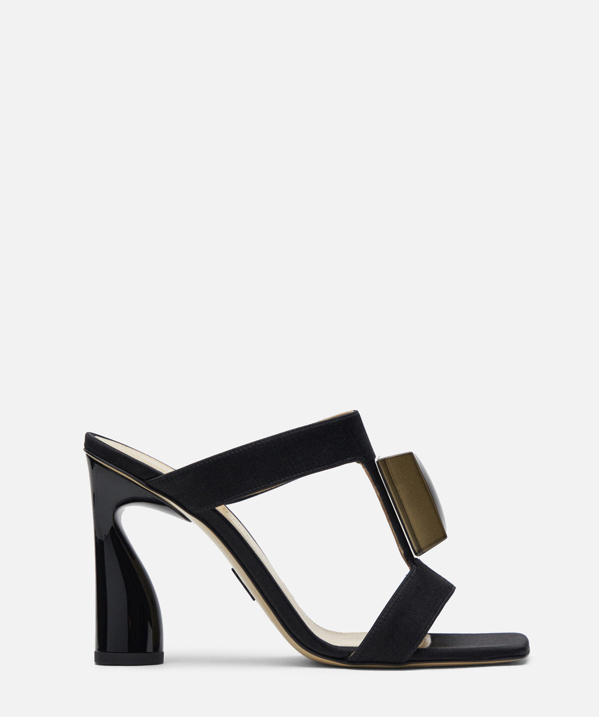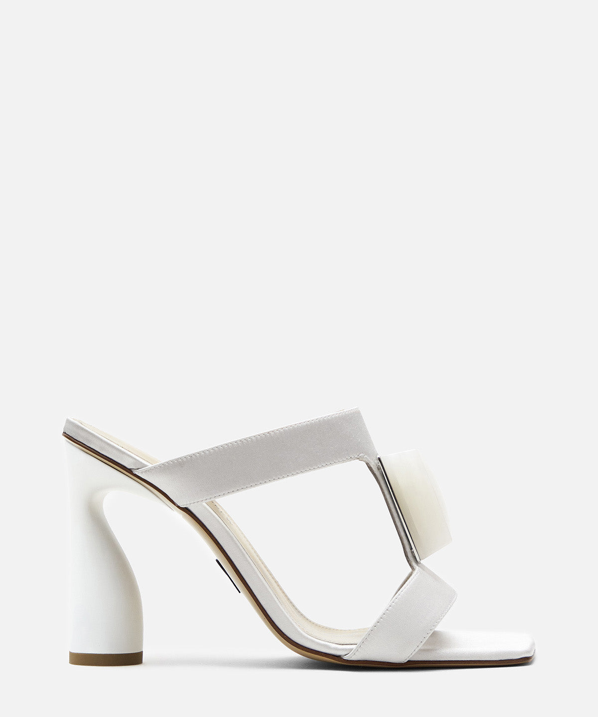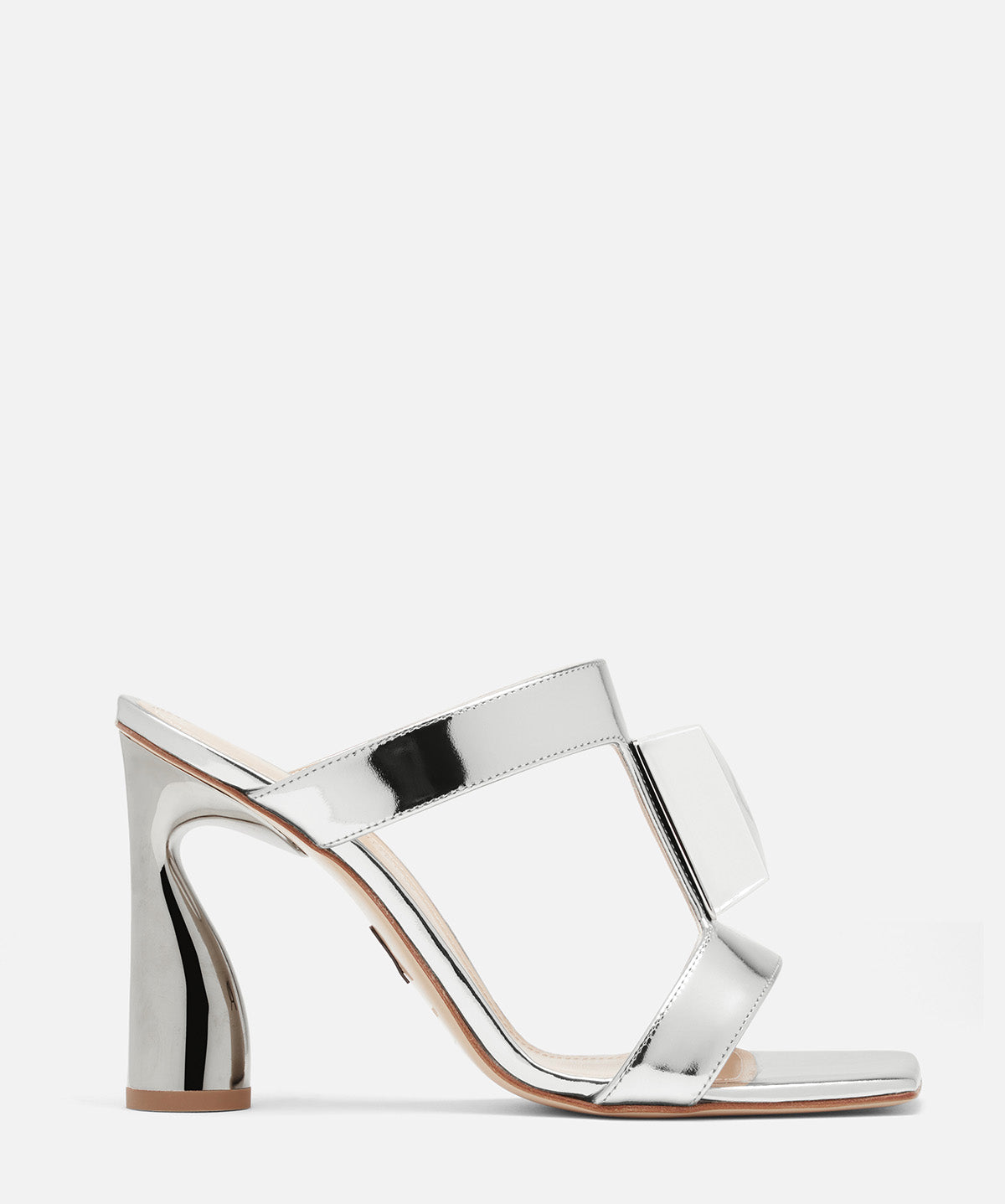 OPEN TOE MULE IN SILVER METALLIC MIRROR, FEATURING A TRANSPARENT PLEXIGLASS ICE-CUBE ACCESSORY AND OUR SIGNTAURE 95mm SCULPTURAL HEEL WITH A GALVANIC CHROME FINISH