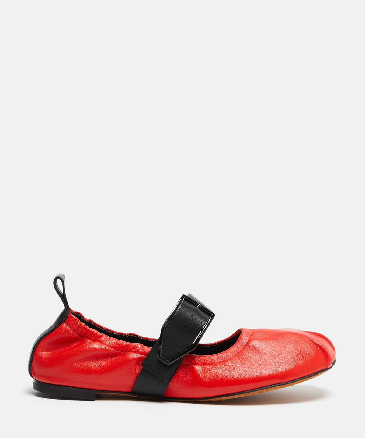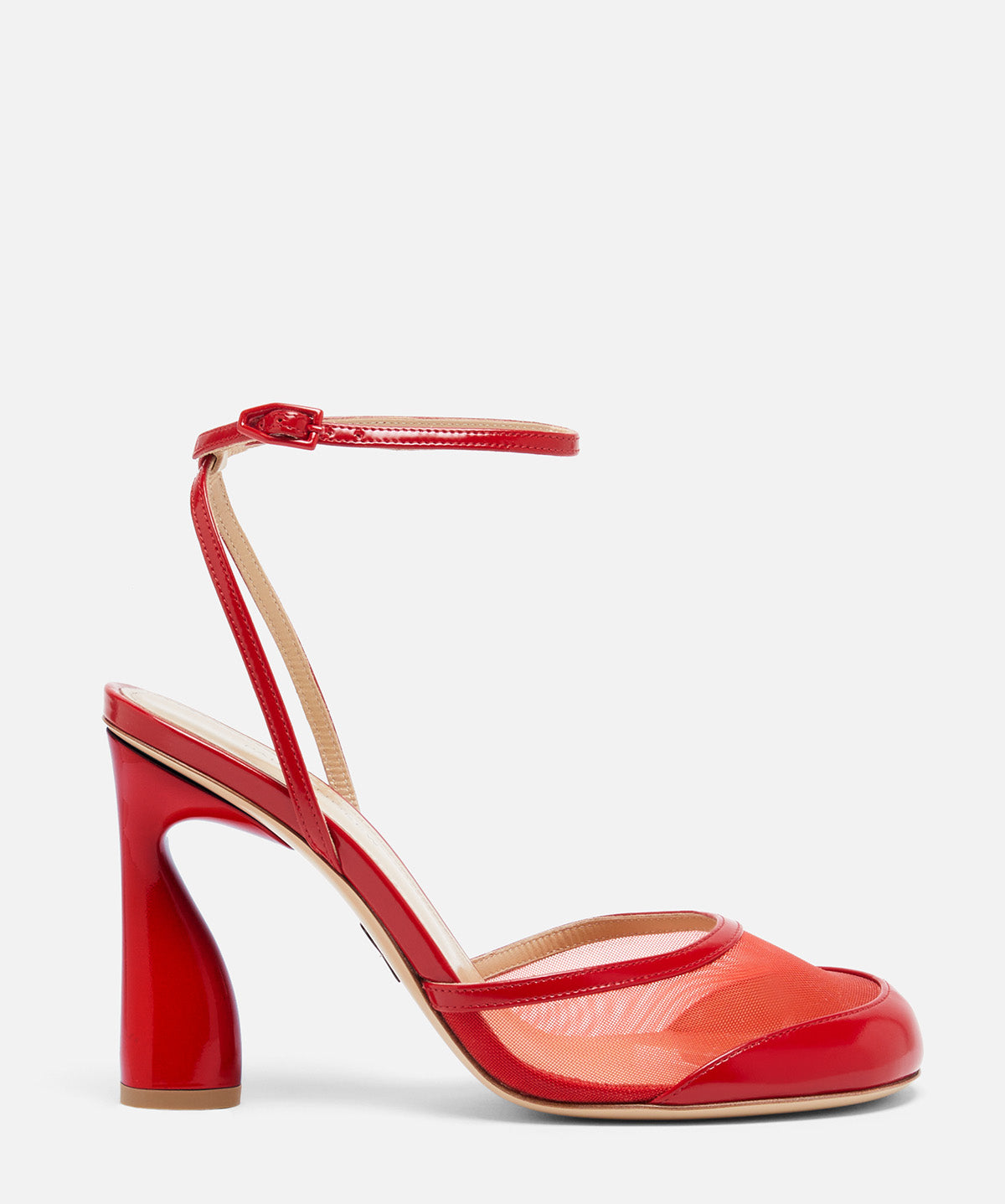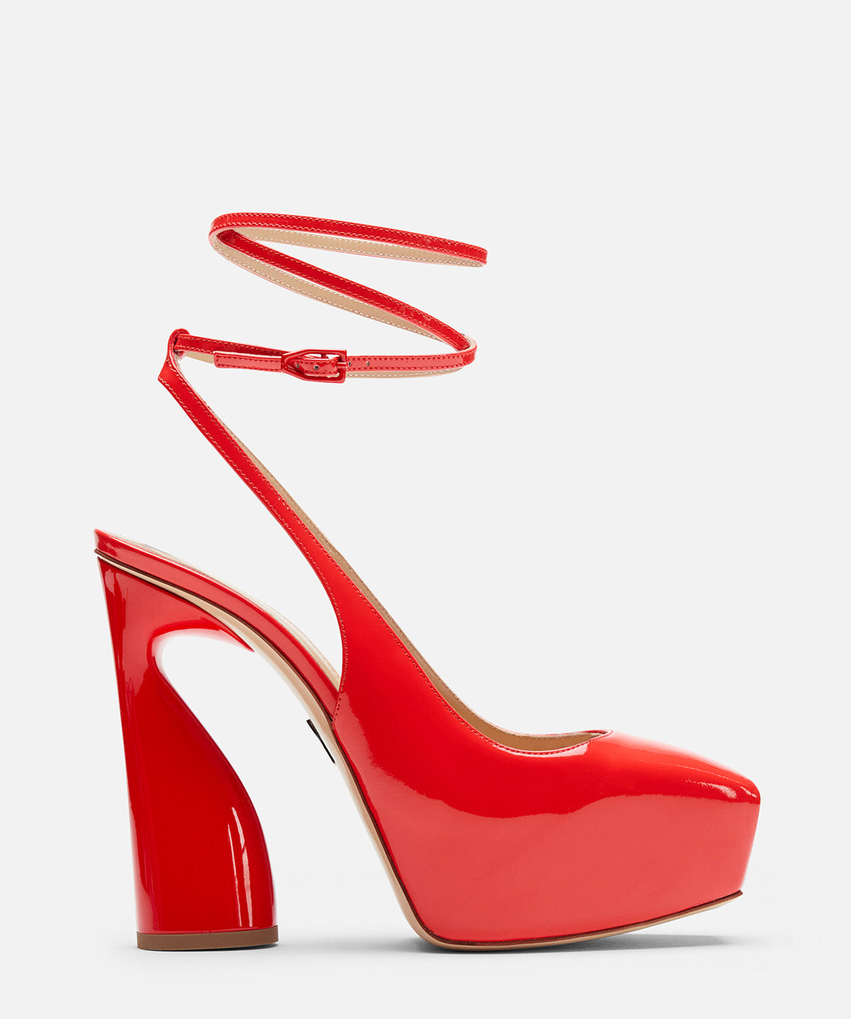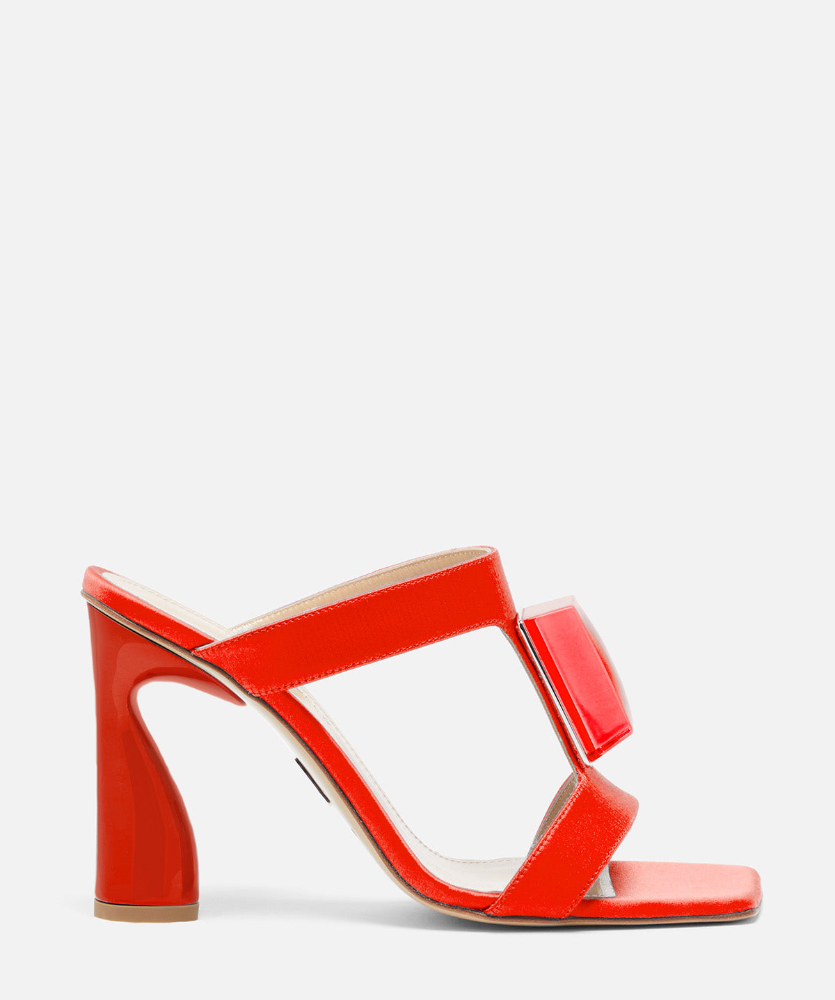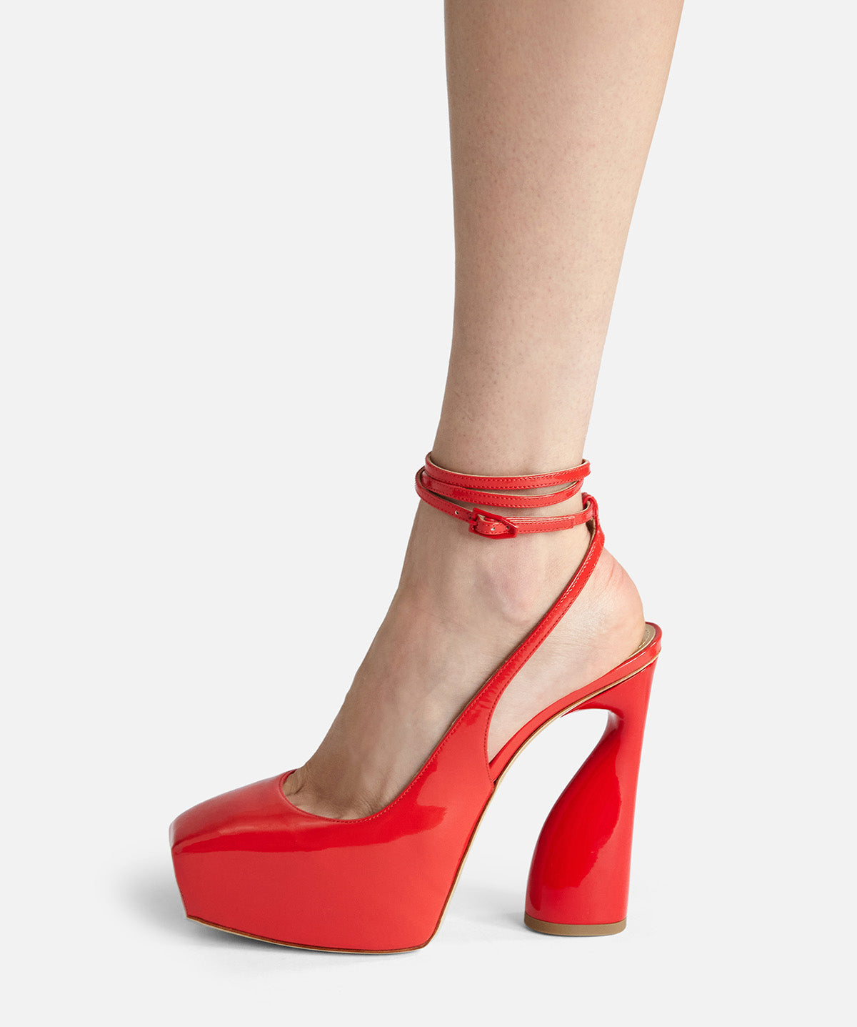 OPEN TOE PLATFORM MULE IN TOMATO PATENT, FEATURING A TONAL PLEXIGLASS ICE-CUBE ACCESSORY ATOP OUR SIGNATURE SCULPTURAL HEEL HAND-WRAPPED IN A NATURAL JUTE ROPE
