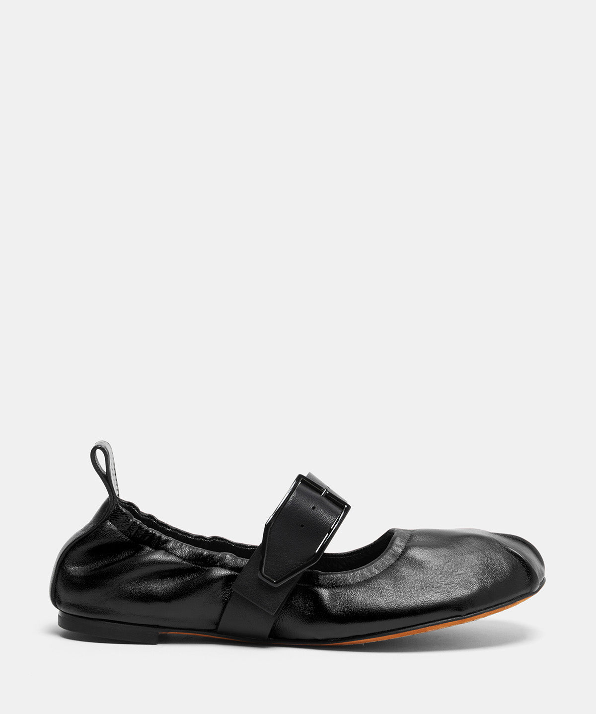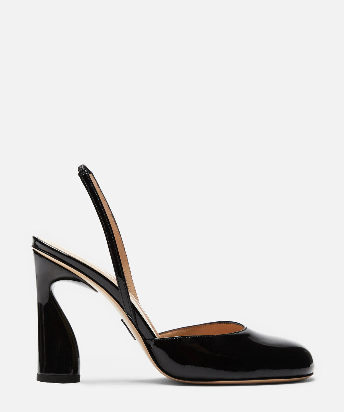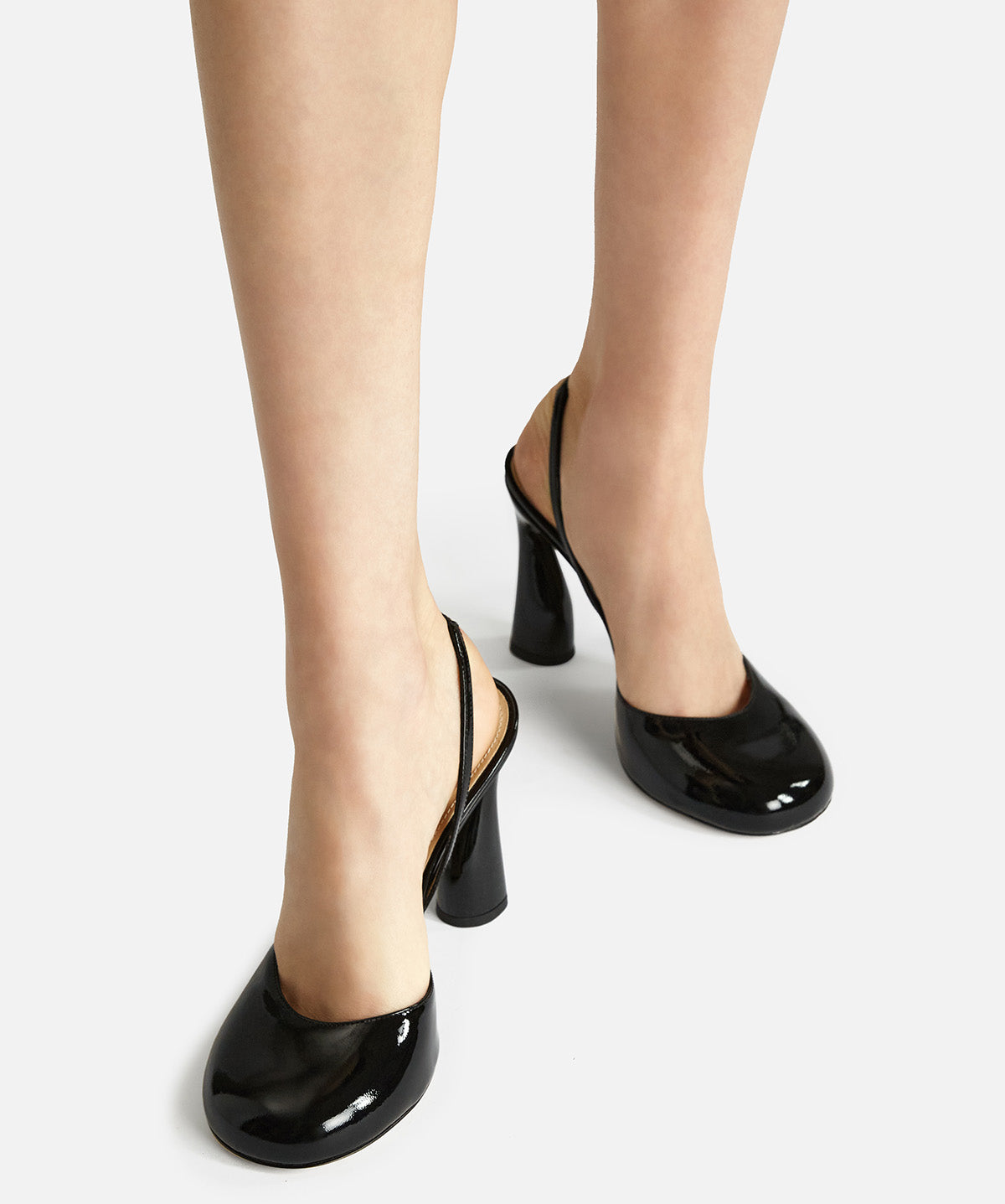 OPEN TOE PLATFORM MULE IN BLACK PATENT, FEATURING A TONAL PLEXIGLASS ICE-CUBE ACCESSORY ATOP OUR SIGNATURE SCULPTURAL HEEL HAND-WRAPPED IN A NATURAL JUTE ROPE