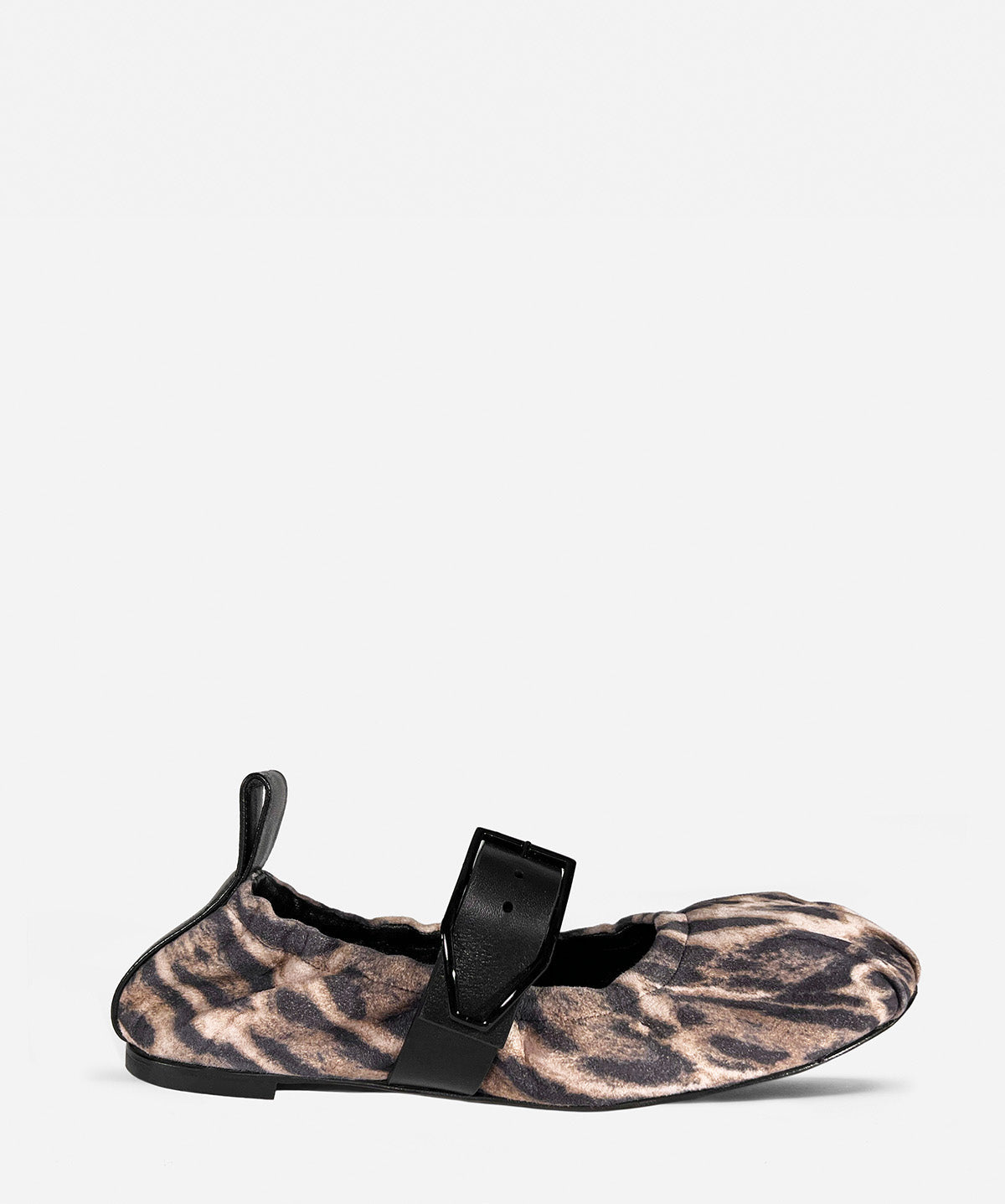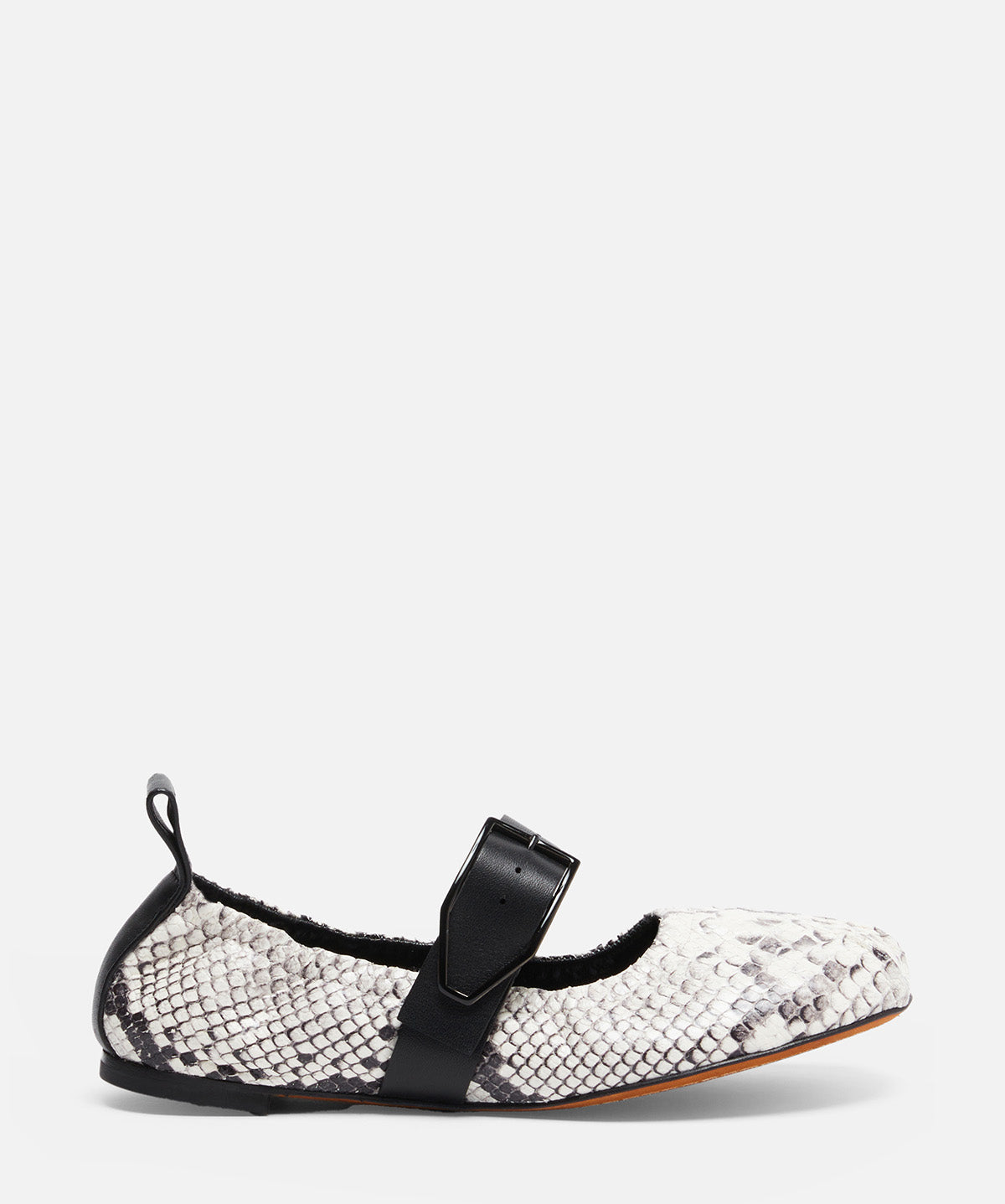 OPEN TOE FLAT MULE IN NATURAL SNAKE PRINT CALF, FEATURING A TRANSPARENT PLEXIGLASS ICE-CUBE ACCESSORY WITH A NATURAL JUTE ROPE FOOTBED WITH A CUOIO LEATHER OUTSOLE