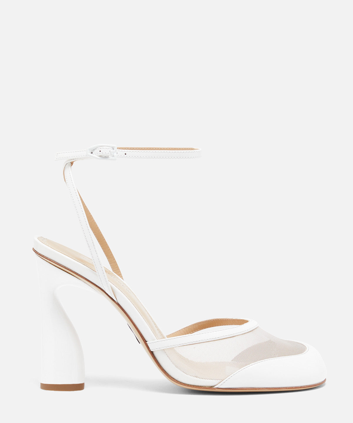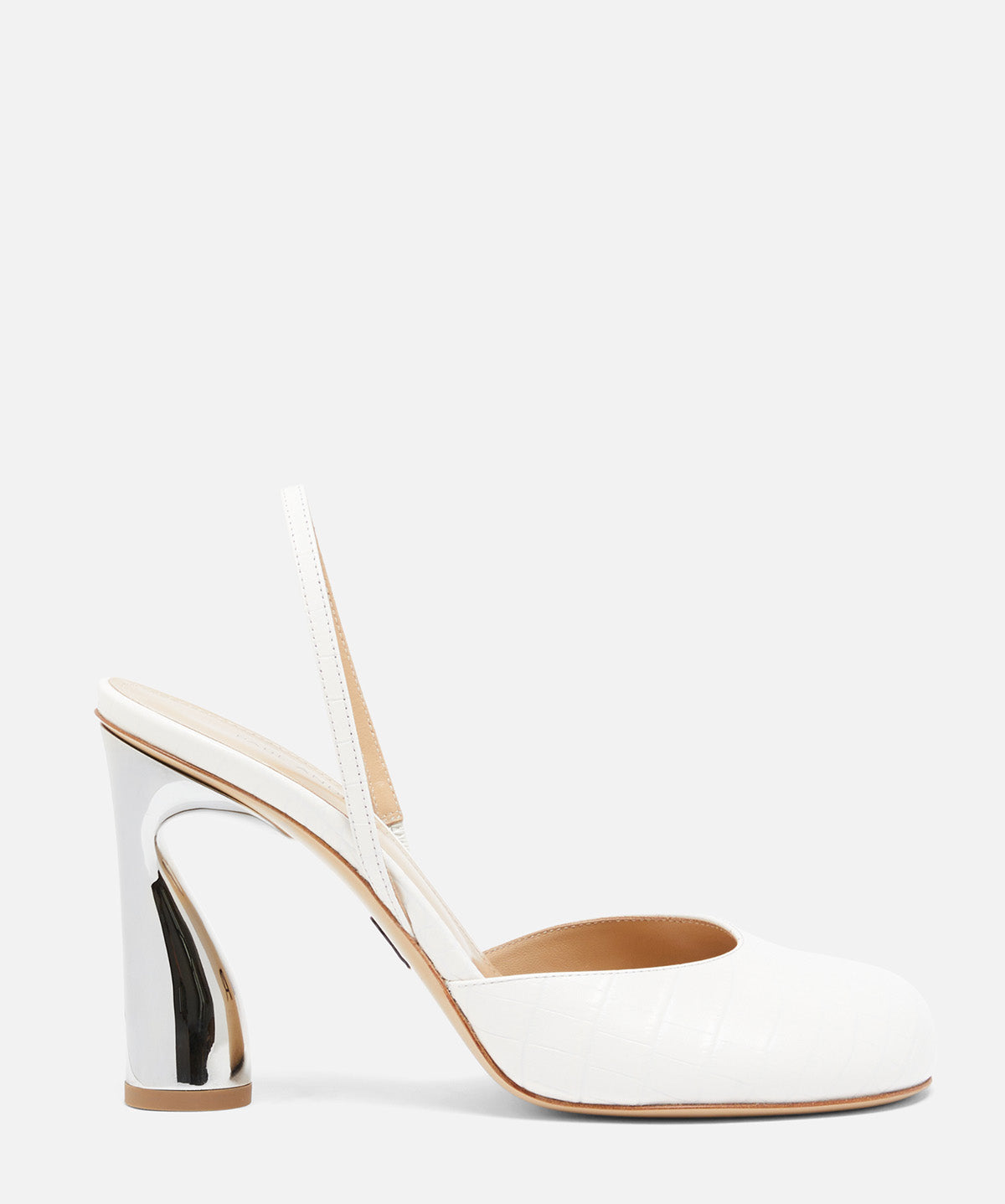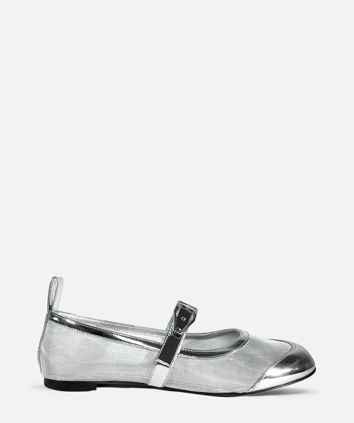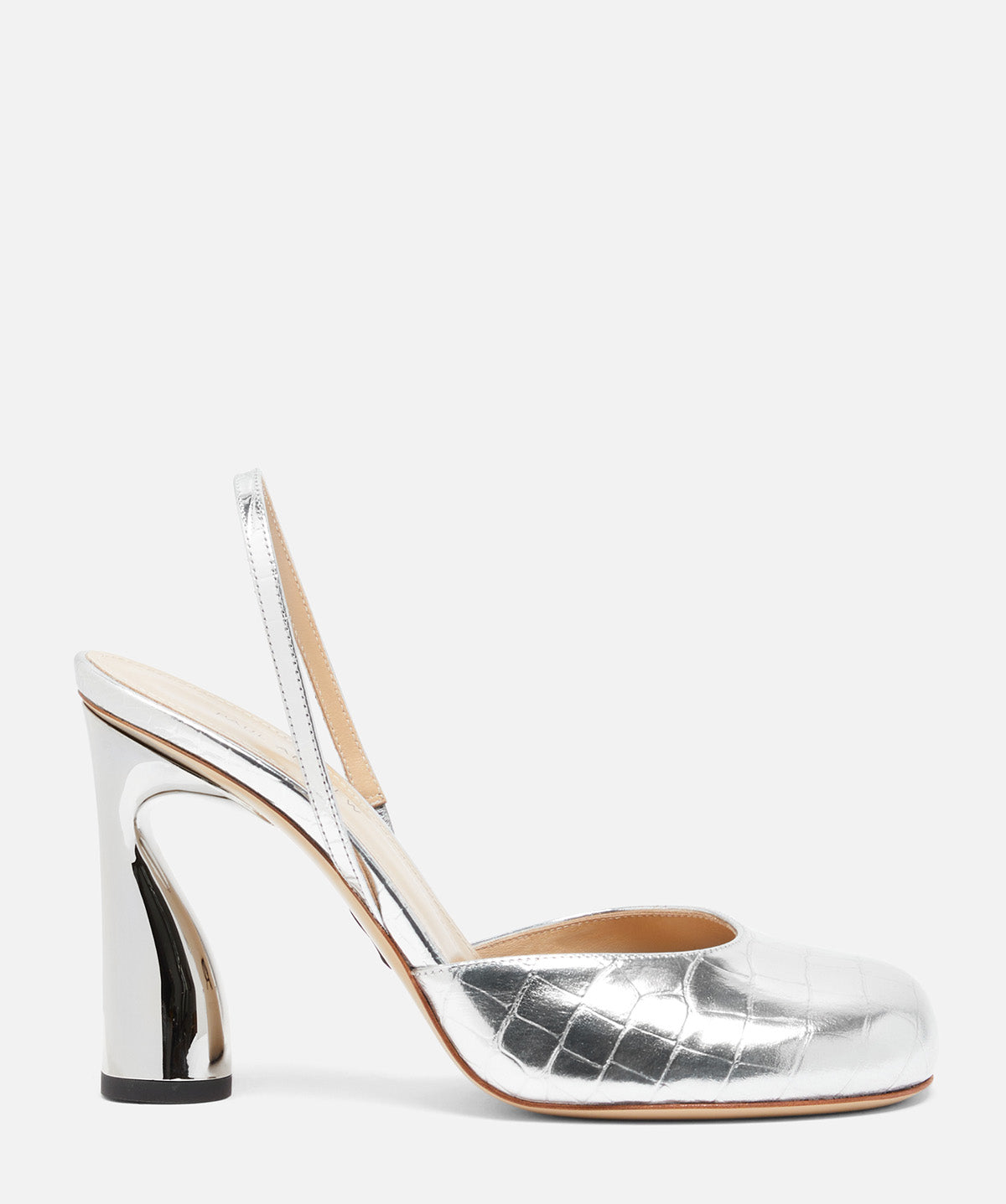 ROUND TOE ANKLE-STRAP PUMP IN SILVER METALLIC MIRROR AND METALLIC MESH WITH OUR SIGNATURE 'A' BUCKLE ATOP A SCULPURAL BLOCK HEEL WITH A GALVANIC CHROME FINISH