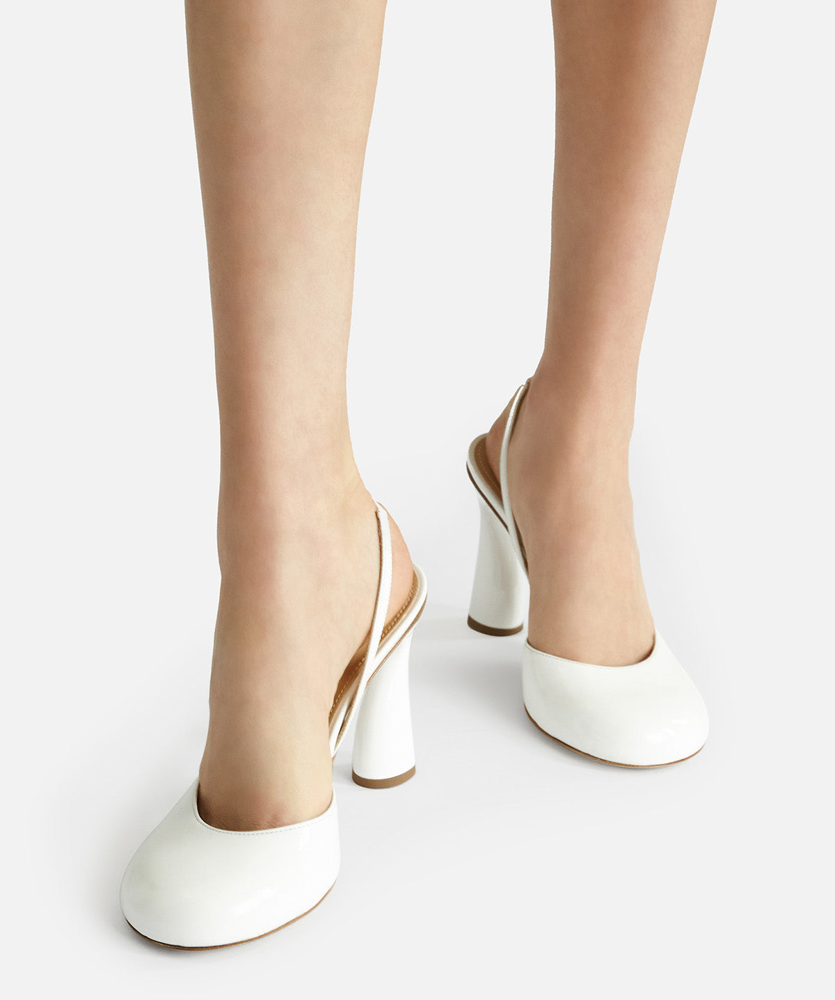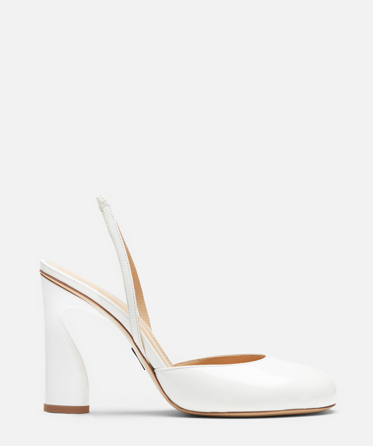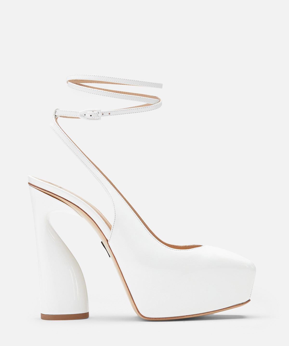 OPEN TOE PLATFORM SANDAL IN WHITE PATENT, FEATURING A TRANSPARENT PLEXIGLASS ICE-CUBE ACCESSORY ATOP OUR SIGNATURE SCULPTURAL HEEL HAND-WRAPPED IN A NATURAL JUTE ROPE