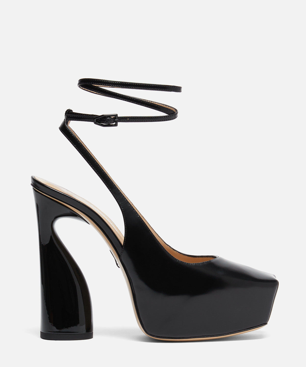 OPEN TOE PLATFORM SANDAL IN BLACK PATENT, FEATURING A TONAL PLEXIGLASS ICE-CUBE ACCESSORY ATOP OUR SIGNATURE SCULPTURAL HEEL HAND-WRAPPED IN A NATURAL JUTE ROPE