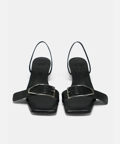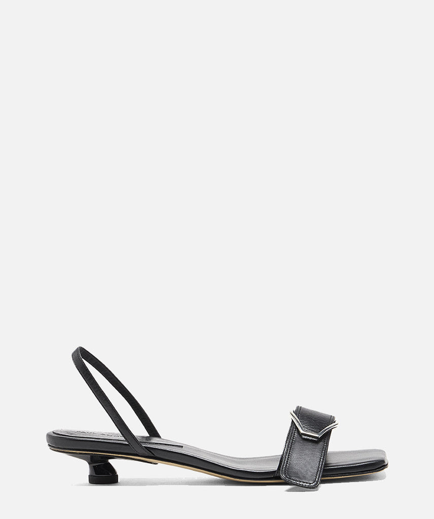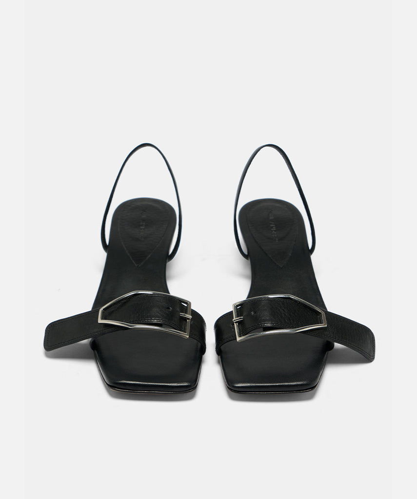HALTERBACK SANDAL IN BLACK SOFT VACCHETTA, WITH A OVERSIZED 'A' BUCKLE IN SILVER, FEATURING OUR LOW SIGNATURE SCULPTURAL HEEL