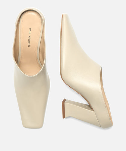 SQUARE TOE, SOFT CONSTRUCTION, MULE IN SANDSTONE SOFT NAPPA WITH A SCULPTURAL BLOCK HEEL