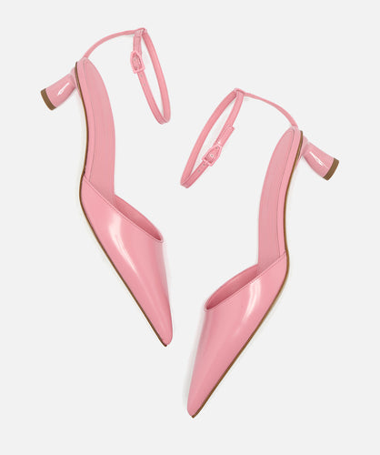 POINTED TOE PUMP IN FLAMINGO SPAZZOLATO ATOP OUR SIGNATURE SCULPTURAL LOW HEEL, FEATURING AN ADJUSTABLE SLIM ANKLE STRAP WITH A TONAL 'A' BUCKLE