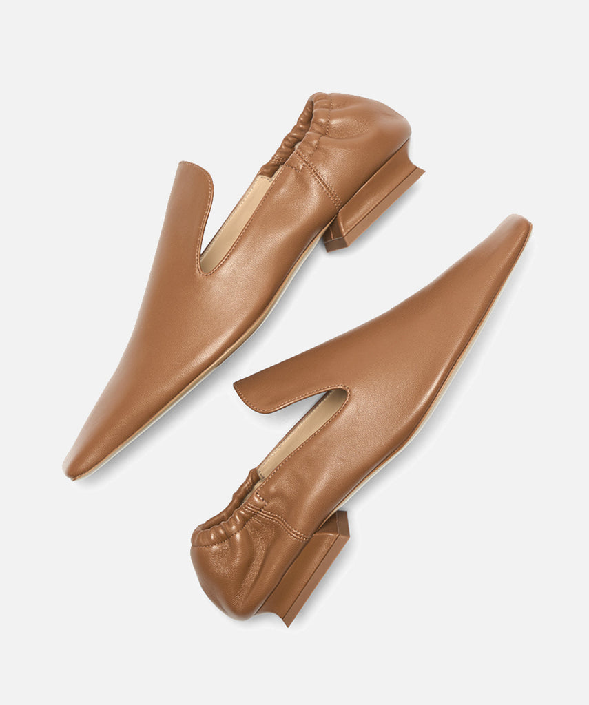 SQUARE TOE, SOFT CONSTRUCTION, LOAFER IN NUTMEG SOFT NAPPA WITH A SCULPTURAL BLOCK HEEL