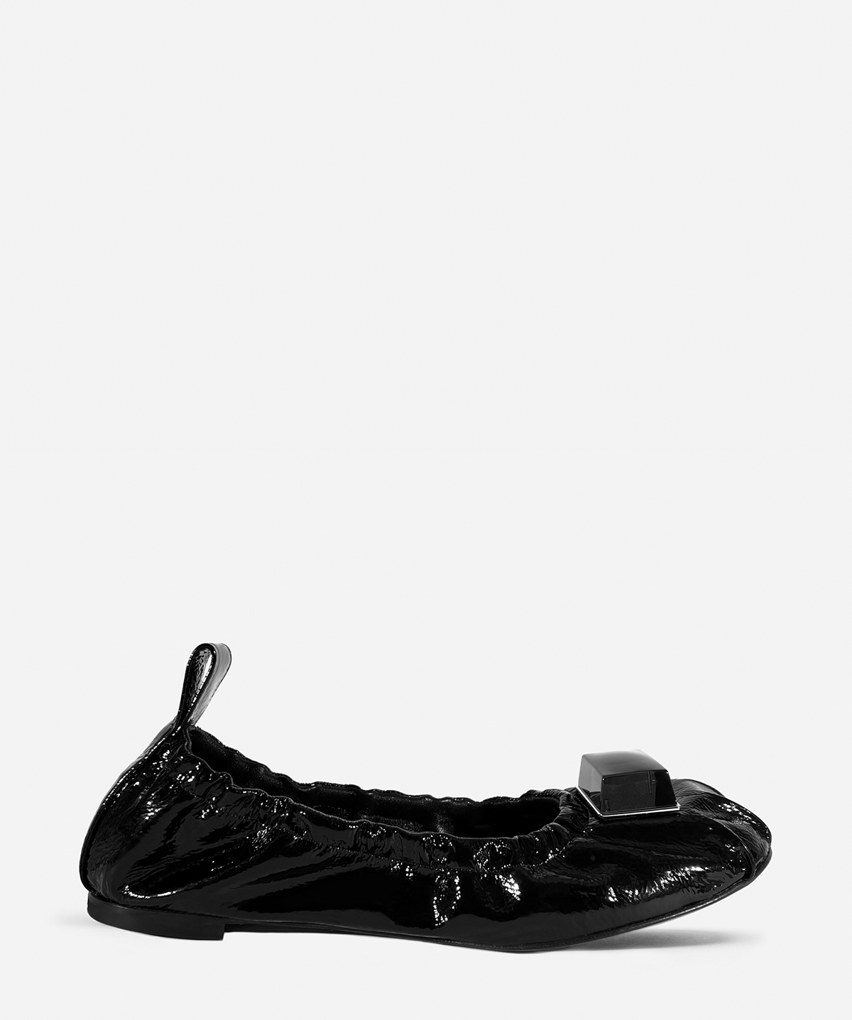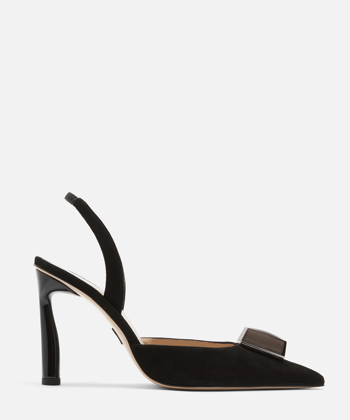 POINTED TOE HALTER-BACK PUMP IN BLACK SUEDE, FEATURING A TONAL PLEXIGLASS ICE-CUBE ACCESSORY AND OUR SIGNATURE SCULPTURAL STILETTO HEEL WITH A LACQUER FINISH