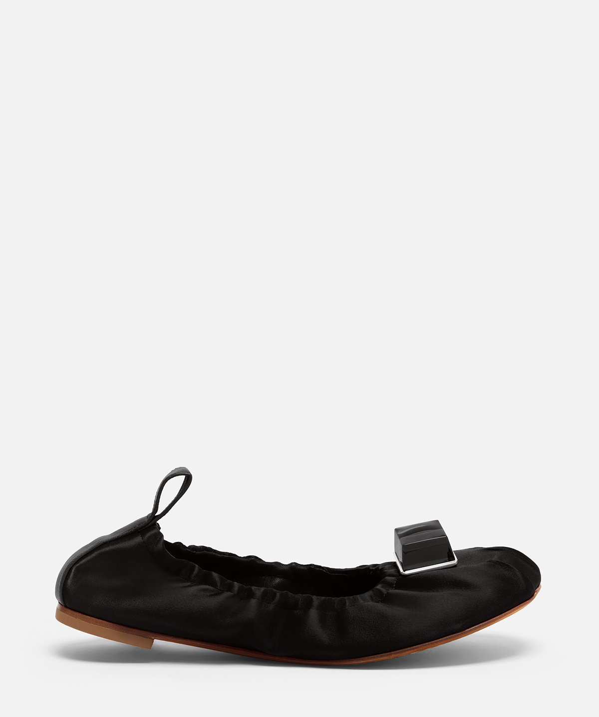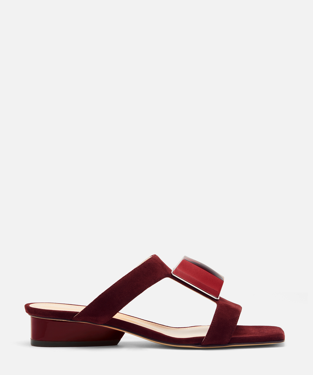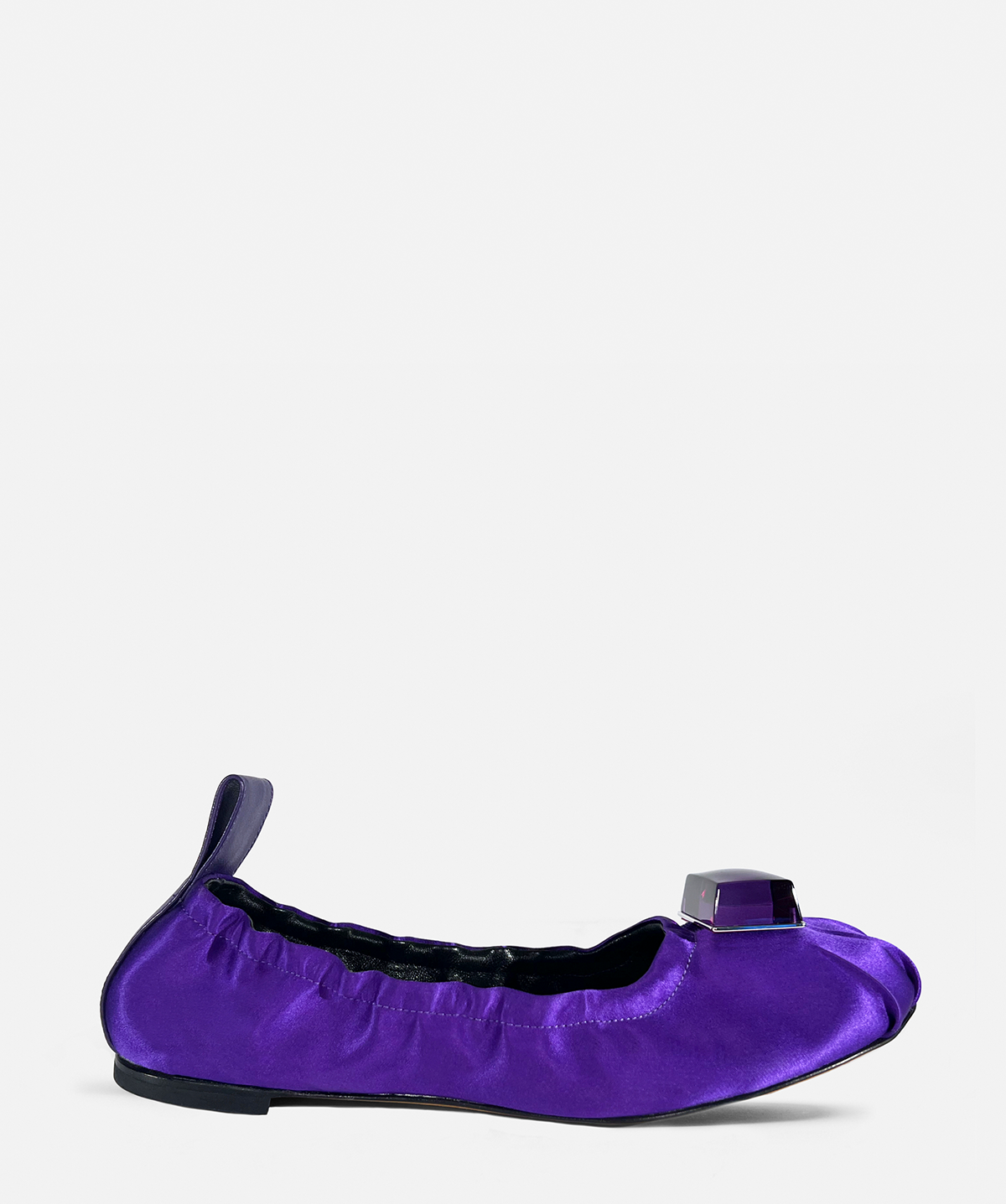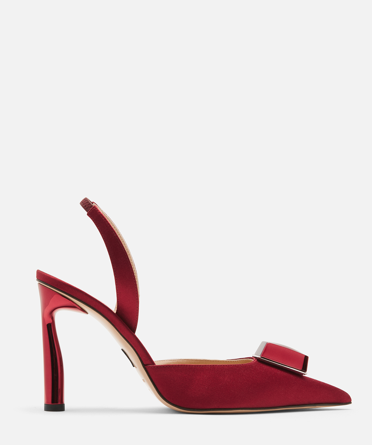 POINTED TOE HALTER-BACK PUMP IN BLACK CHERRY SATIN, FEATURING A TONAL PLEXIGLASS ICE-CUBE ACCESSORY AND OUR SIGNATURE SCULPTURAL STILETTO HEEL WITH A GALVANIC FINISH