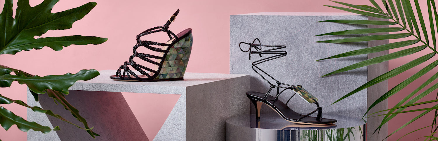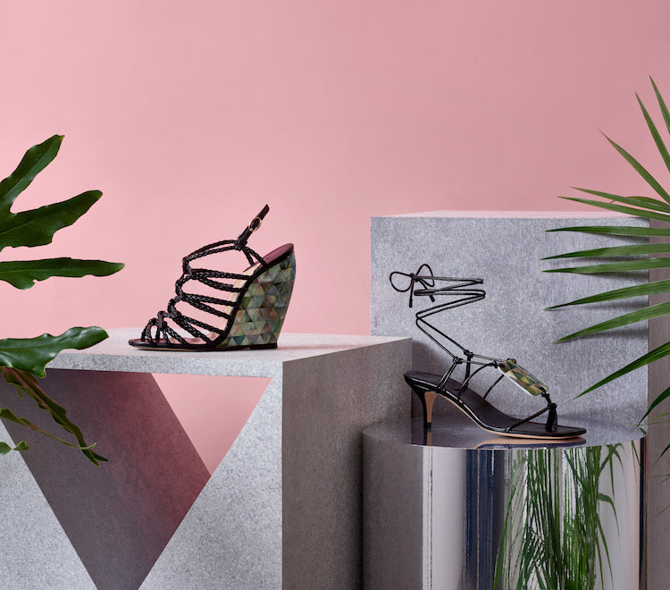 A striking sharkfin silhouette in luxurious woven nappa leather and a custom developed graphic abalone shell wedge on a 115mm height.